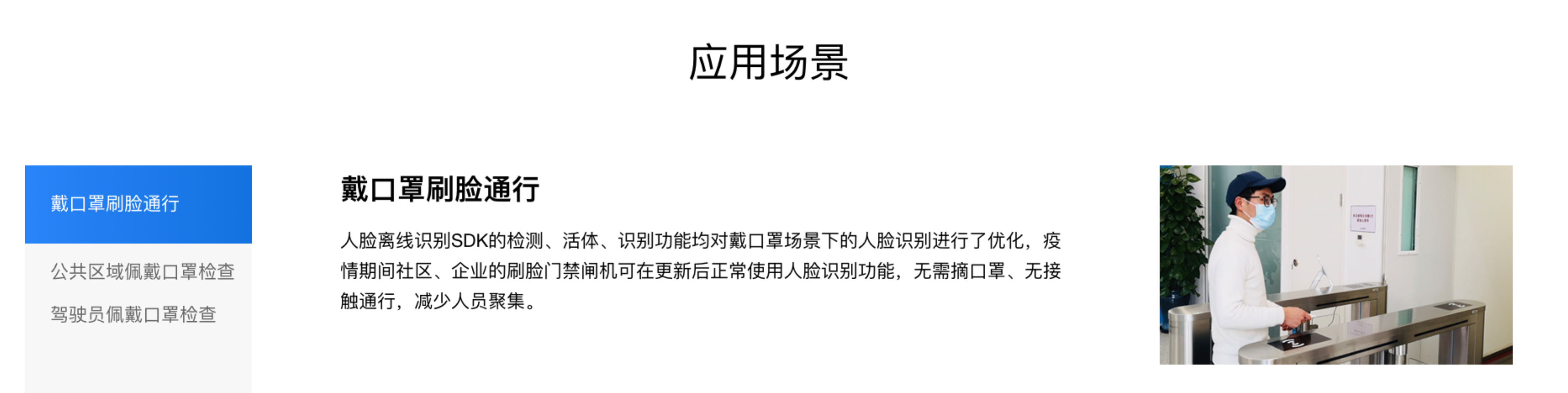 对于大众戴着口罩出门,在部分公共场合需要进行身份核验的需求,百度智能云也提供了相应的技术解决方案。首先,百度智能云针对戴口罩场景下的“人脸识别”,在其原算法模型的基础上优化了识别效果,实现佩戴口罩的人脸检测准确率超99%以上。其次,还将戴口罩场景下的人脸离线识别SDK、人脸私有化口罩识别模型快速上线百度智能云官网开启邀测,在疫情期间免费开放,以期进一步提高大众在使用人脸闸机或进行考勤打卡时的通行效率,降低摘下口罩的感染风险。
