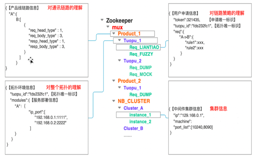 配置中心:即控制平面,是整个中间件系统的大脑,接收申请平台发过来的配置,以结构化的配置进行存储。配置中心以zookeeper为底层,对整个被测系统进行了3个层次的抽象: