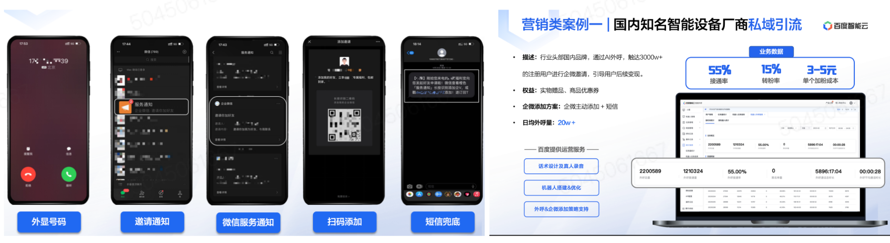 为小度智能终端产品打造的智能外呼服务,协助小度用户添加官方服务号,低成本、高效率持续引流,为后续私域运营打好基础。