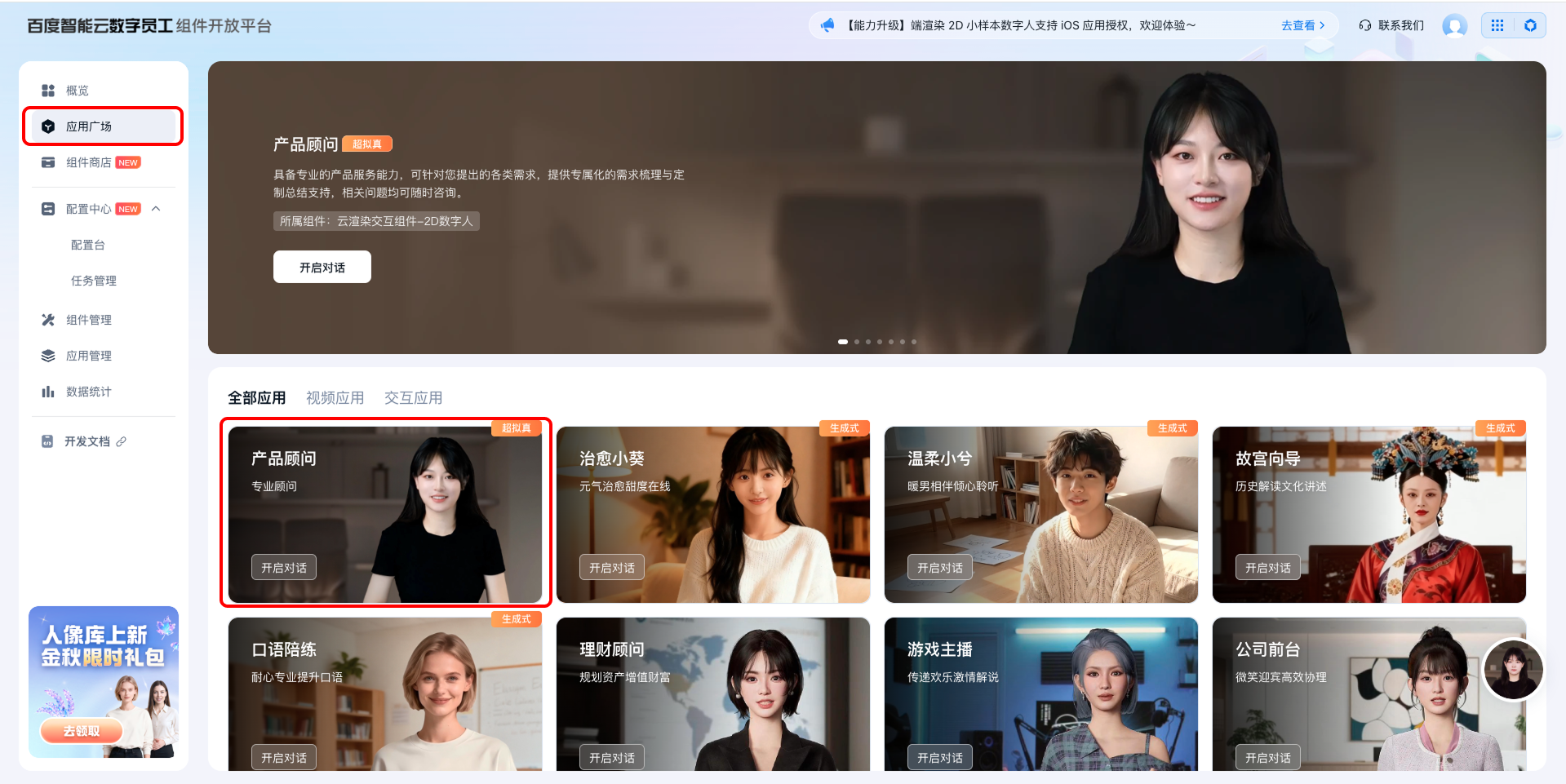 | 产品顾问样板间全新升级 | 能力升级 | 采用「形象定制-2D 超拟真数字人」组件,全新人像表现更加灵动拟人、自然逼真,细节表现与真实感全面提升。 想体验超拟真人像效果?一键直达,查看升级后的形象表现。 ![]() |