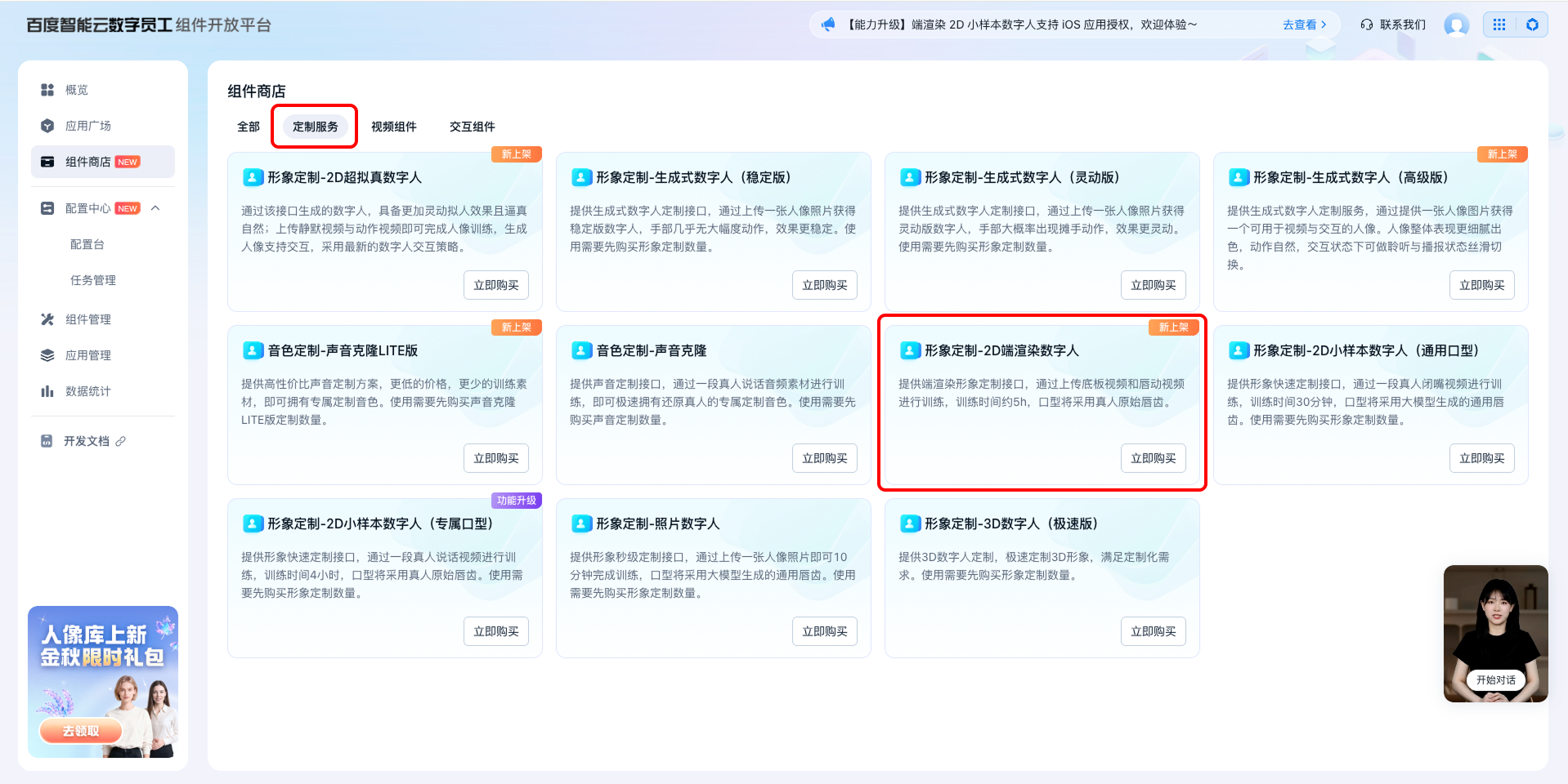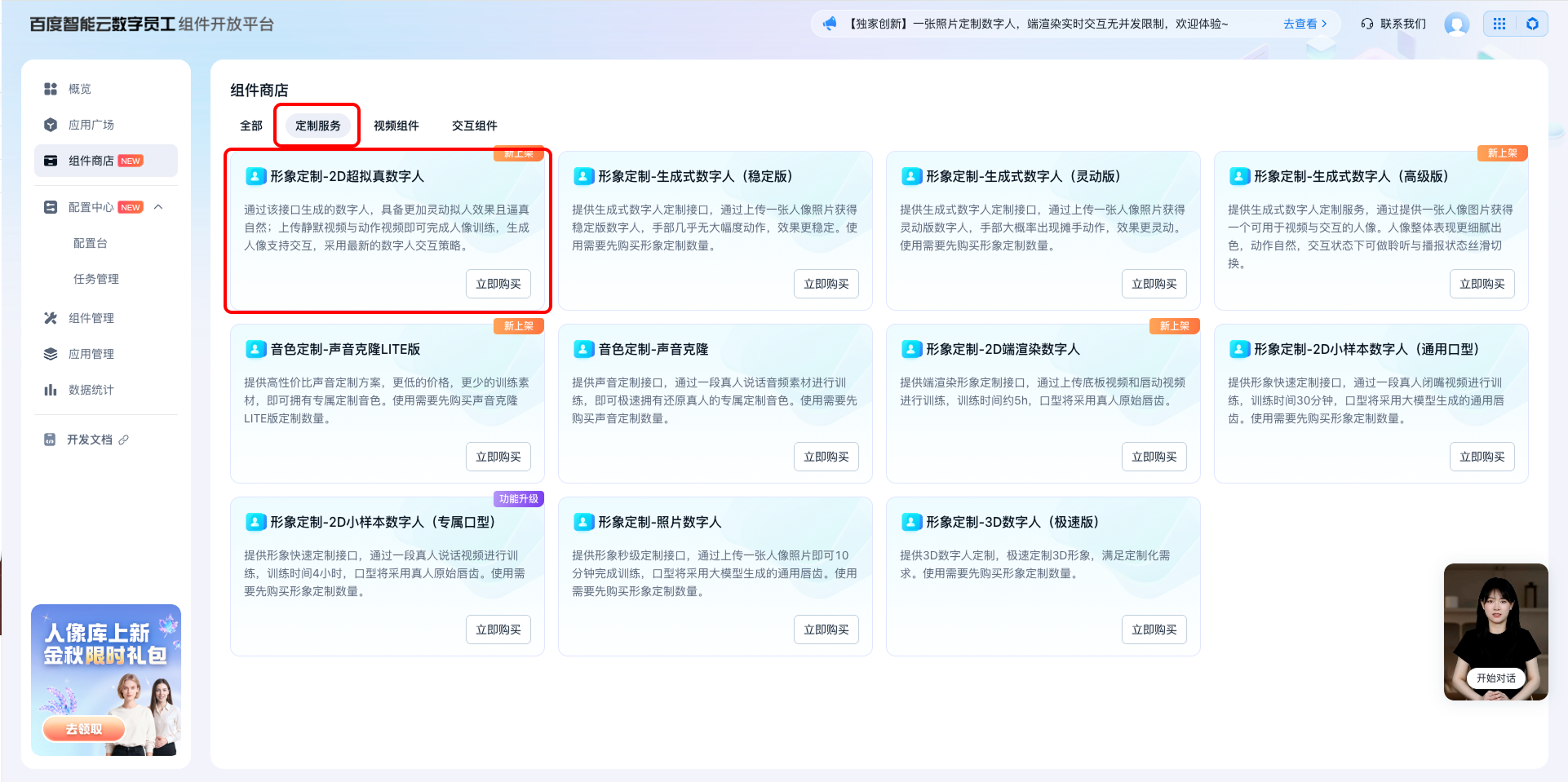 体验入口:应用广场 组件购买:形象定制-2D超拟真数字人 |