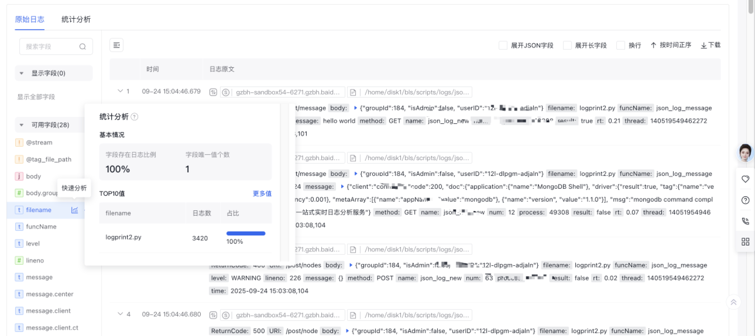 数据下载 | 如需将查询结果数据下载到本地,可点击“下载”,下载JSON或CSV格式的日志数据![]() |