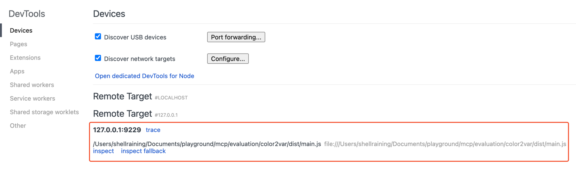 chrome://inspect,找到 9229 端口启动的程序,点击 inspect 开始调试(如果没有找到 9229 端口,请点击页面上第二个 checkbox 里面的 configure 按钮,在里面把 9229 端口加上)。