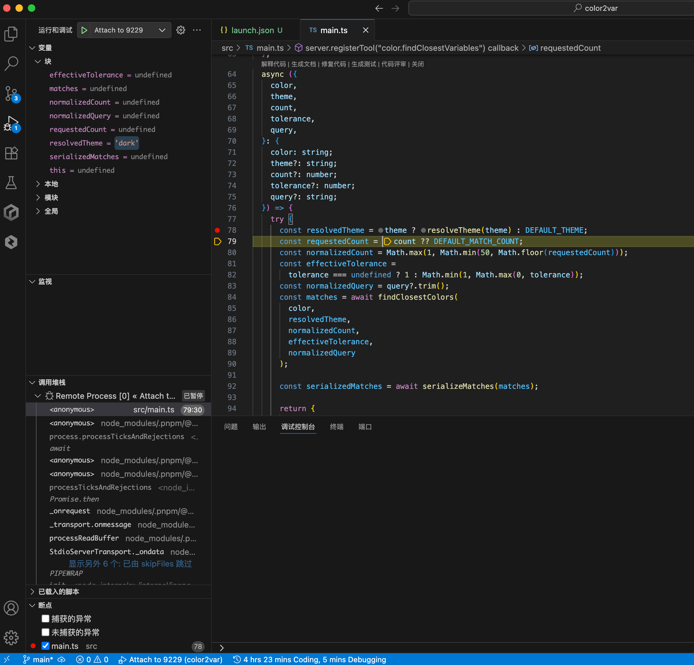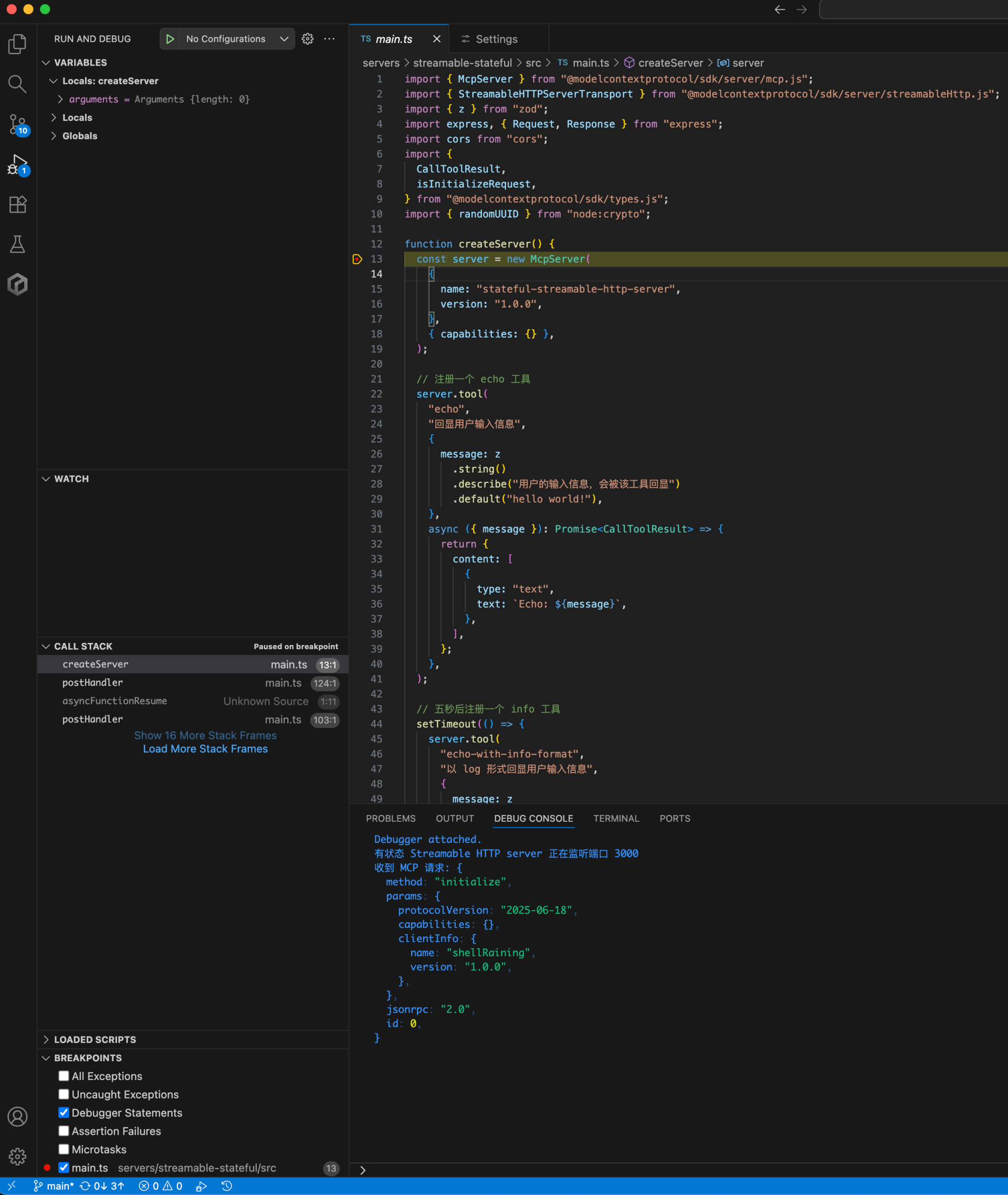 Remote 类型的 MCP server debug 起来就相对轻松多了,因为我们是先启动 server,然后等待 client 的连接,因此可以直接使用 launch 的方式启动,不必通过 attach 的方式间接 debug。由于我们通过 TypeScript SDK 编写代码,因此我这里极力推荐使用 bun 运行时来进行 debug,他能够直接运行 TypeScript 代码。