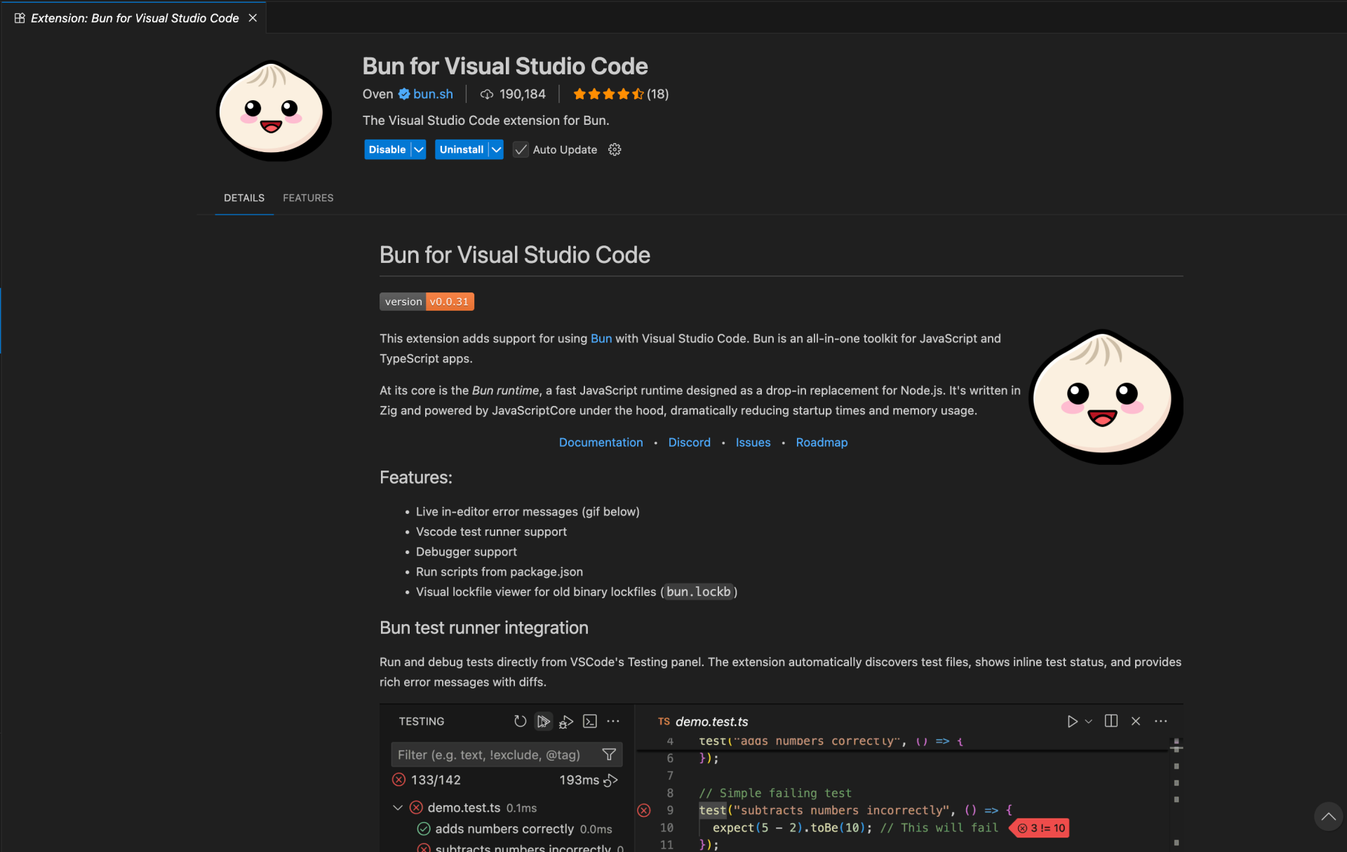 https://bun.com/docs/installation来做; - 在 VSCode 拓展商店下载 bun for visual studio code。