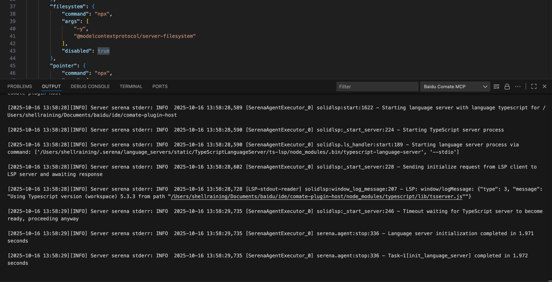 如果不喜欢断点调试的方式,可以通过 log 来判断,方式是打开 Comate 控制台,然后跳转到 output 栏,选择 Baidu Comate MCP 输出通道,就可以看到所有的日志信息,因为我们是通过 stderr 通道输出,因此会有一个前缀 “Server xxx stderr:”,后面是实际的日志信息。