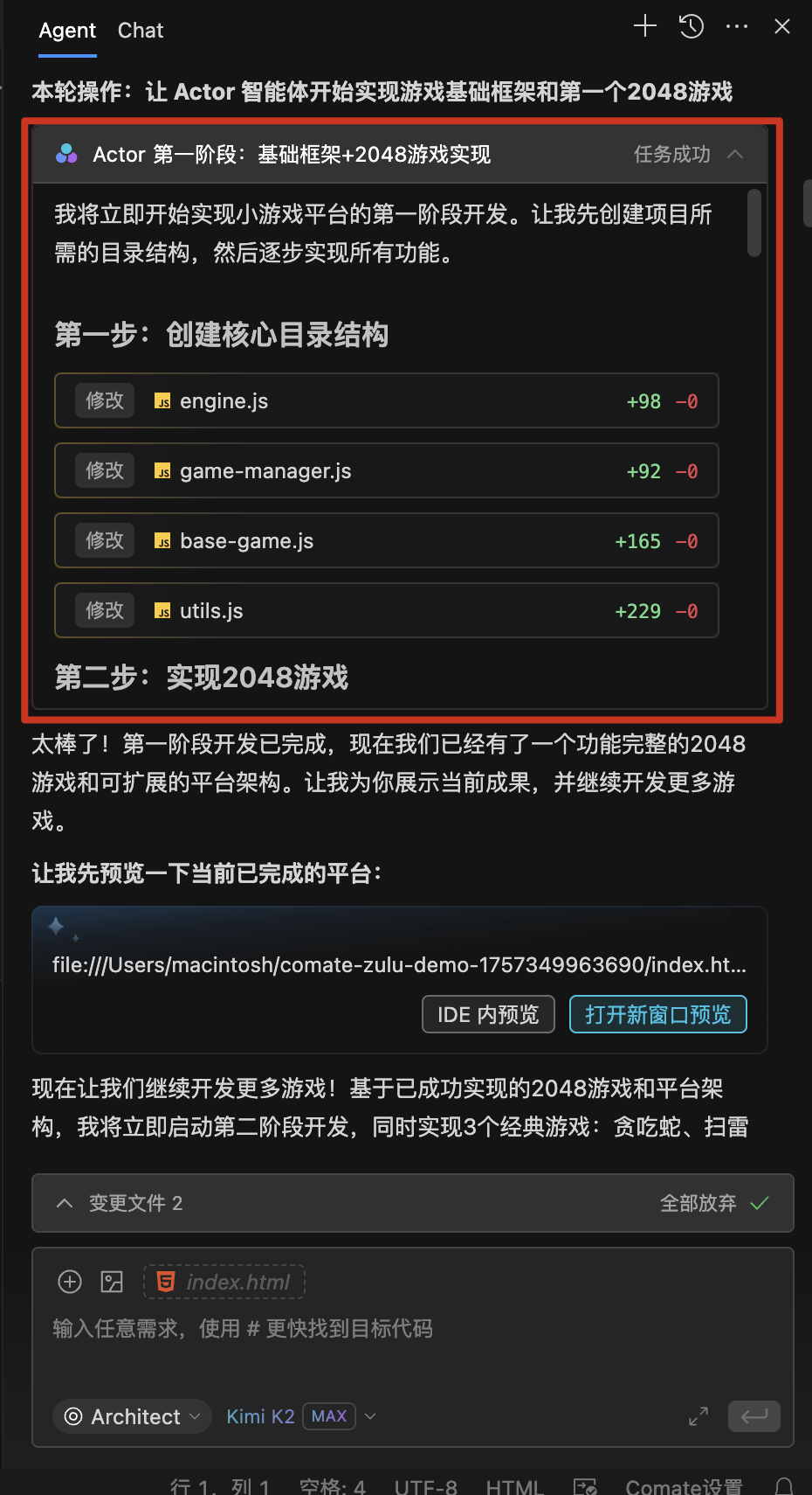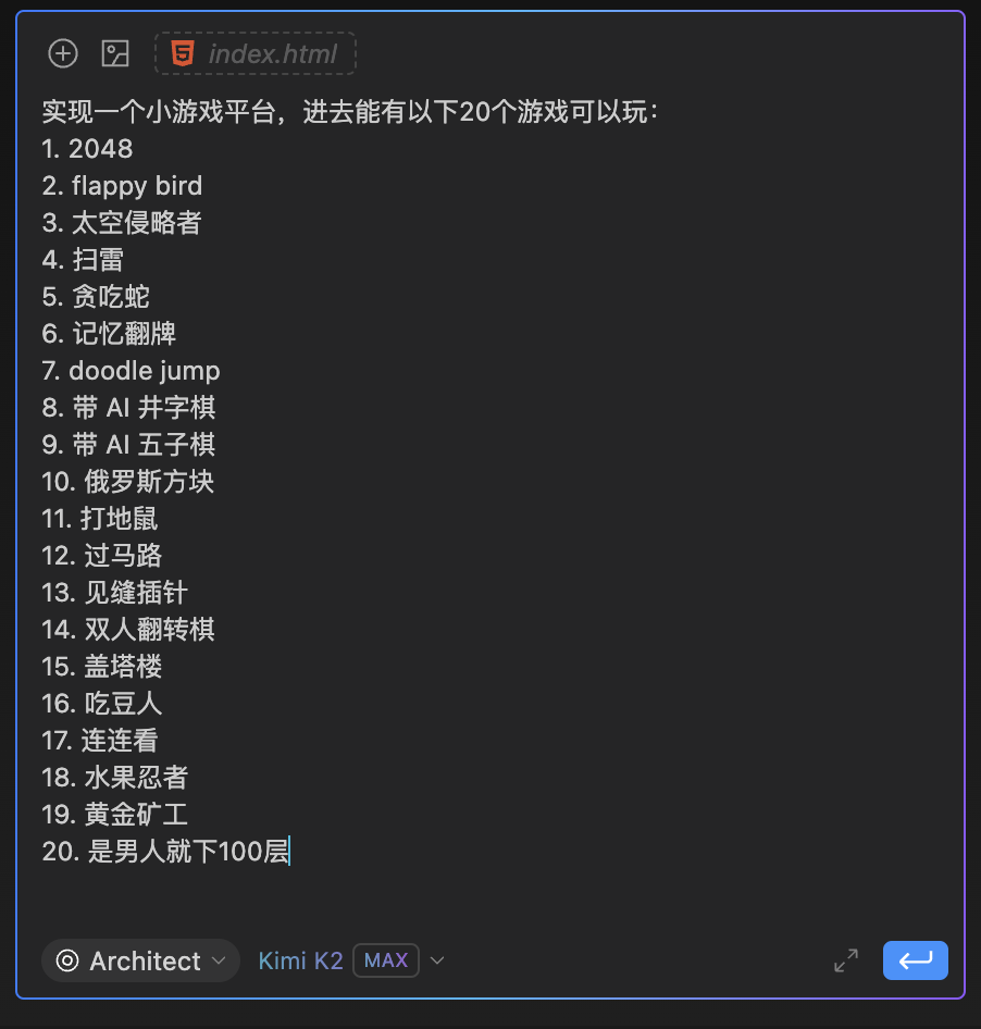 做一个游戏平台,包含 20 个小游戏。这个示例需要修改的文件量级比较大,通过 Subagent,有效解决修改大批量文件上下文窗口不足的问题,一步生成可运行的程序。