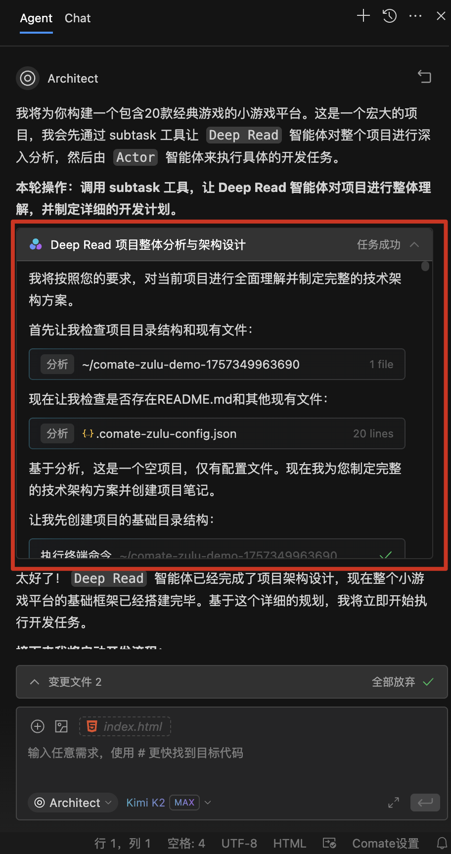 步骤三:先调度 Deep Read Agent,进行项目整体分析和架构设计;子 Agent 执行完成后,将输出结果返回主 Agent Architect。