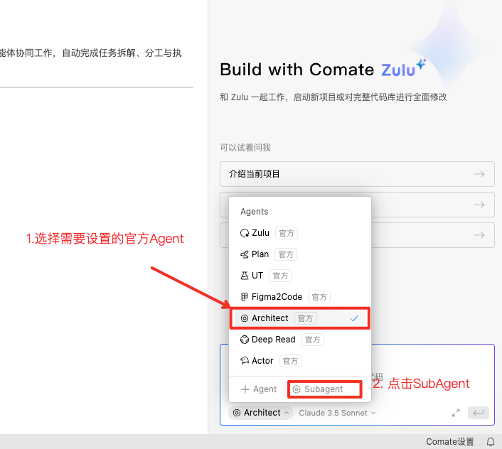 所有官方 Agent 都可以设置 Subagent,从而调度子 Agent 协作完成任务。