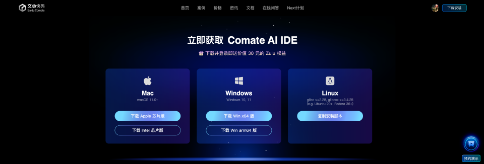 首先安装 Comate AI IDE(v1.100.1以上),详见官网下载页面。