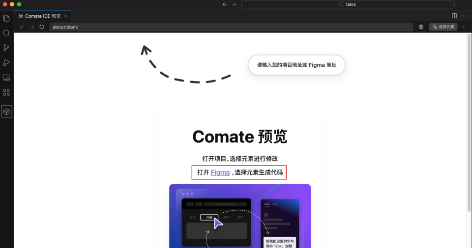 打开Comate AI IDE,点击左侧Open Preview按钮或点击输入框中的figma图标,即可使用预览功能打开figma(首次打开figma需要登录和授权)。