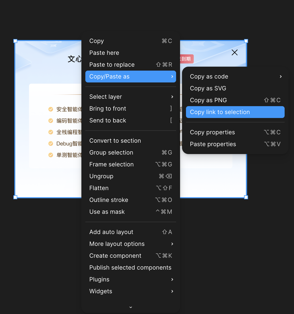启动 Figma 客户端或浏览器,打开 Figma 设计图demo,选择设计稿中的一个节点,右键 Copy/Paste as —> Copy link to selection 复制需要生成的设计稿链接。