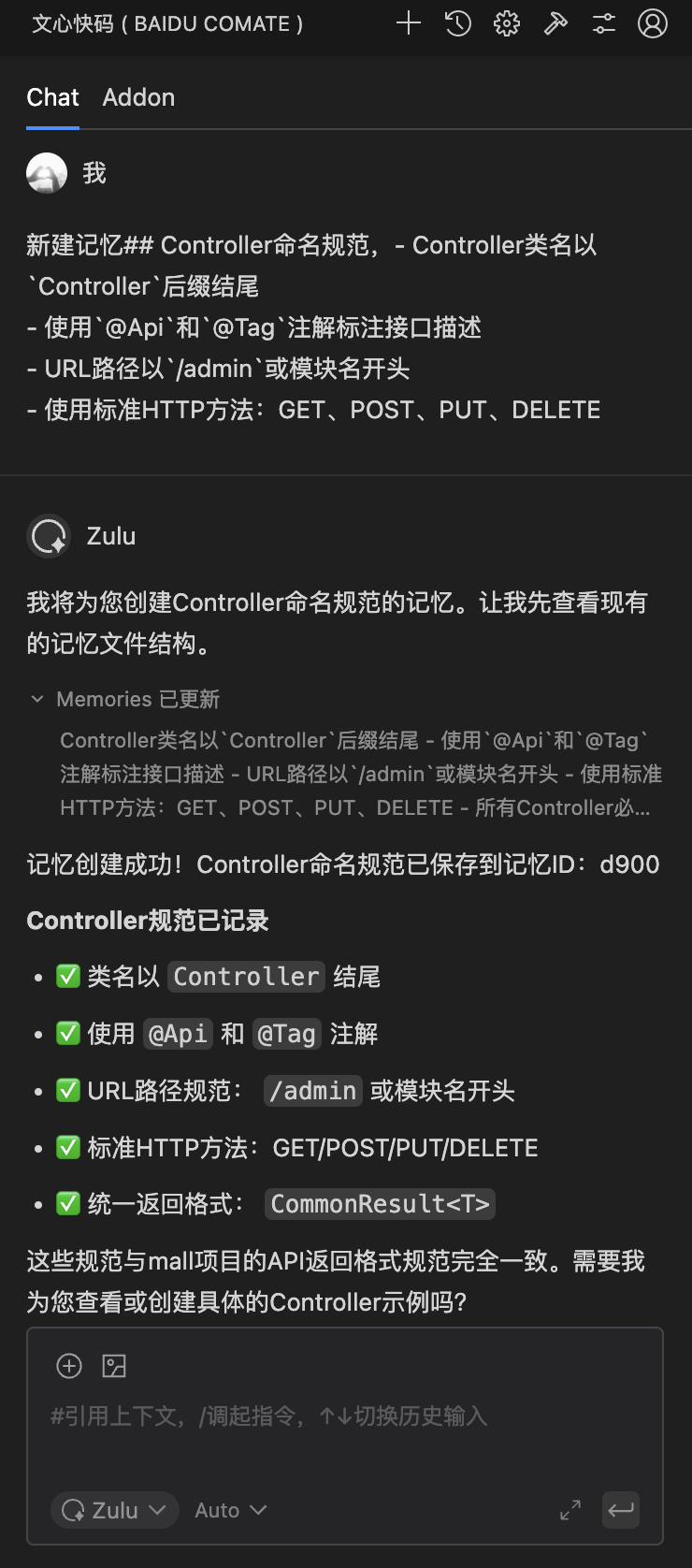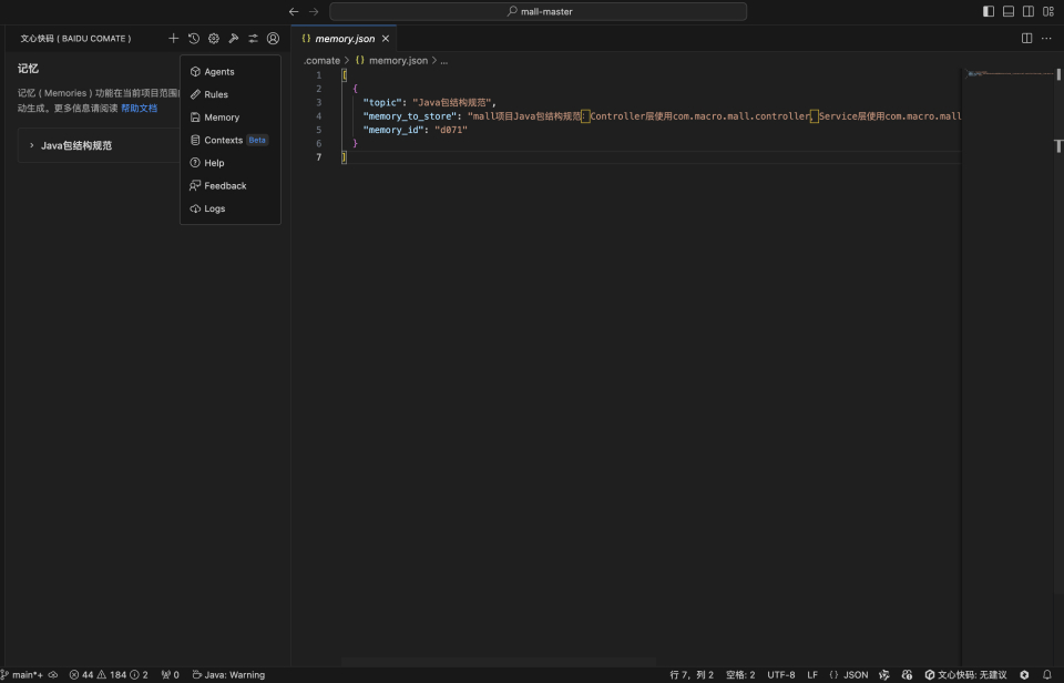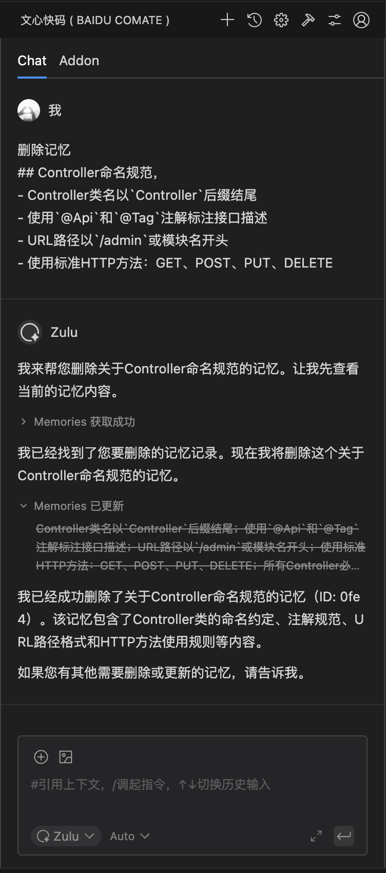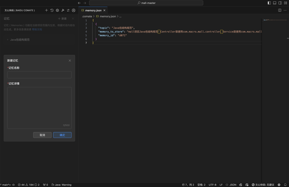 记忆(Memory)功能,支持开发者主动新建记忆,同时在开发者与文心快码的对话过程,会逐渐形成针对工程项目相关的丰富记忆,并自动进行相关的记忆整理和更新。记忆仅对当前项目生效,存储在 .comate 目录下。