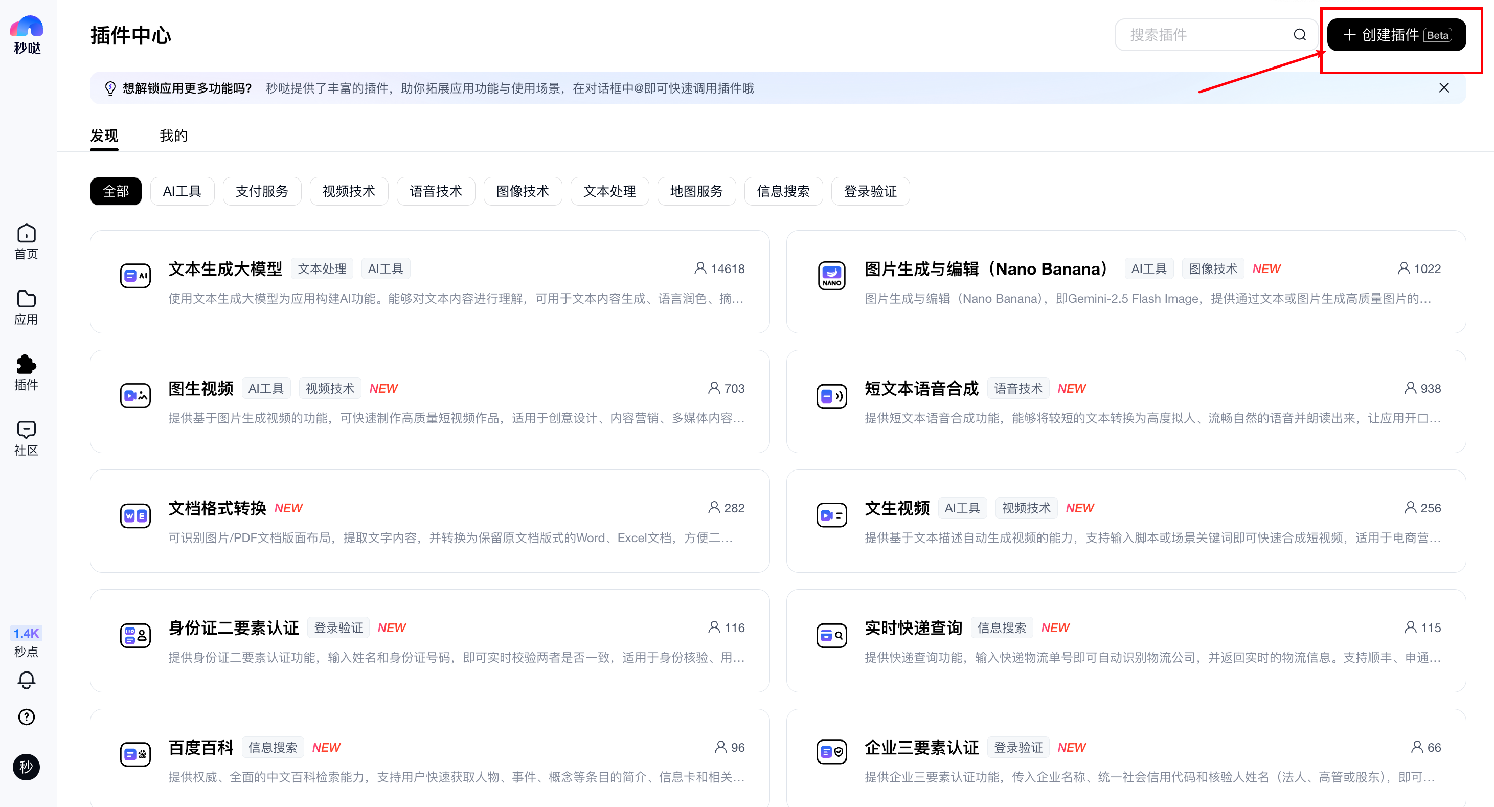 新增共计19个工具类插件,包括OCR识别类7个、人脸识别类3个、语音技术类2个、图像技术类3个、工作效率类4个。秒哒可以基于用户需求,在生成应用过程中规划、调用对应的工具插件满足用户更丰富、更智能的场景需求。