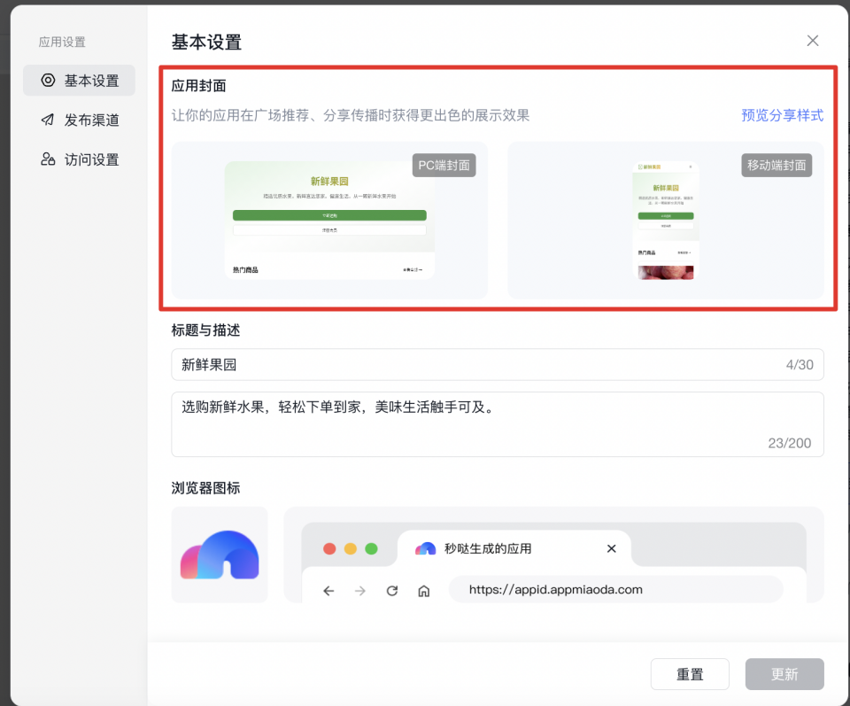 应用发布时新增设置入口,支持所有类型应用配置微信分享样式,解决入口过深及部分应用无法设置的问题。