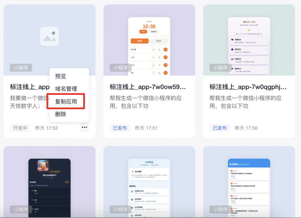 支持一键复制个人应用,快速创建副本,在不影响原有版本的前提下开展安全修改与迭代,降低误操作风险。