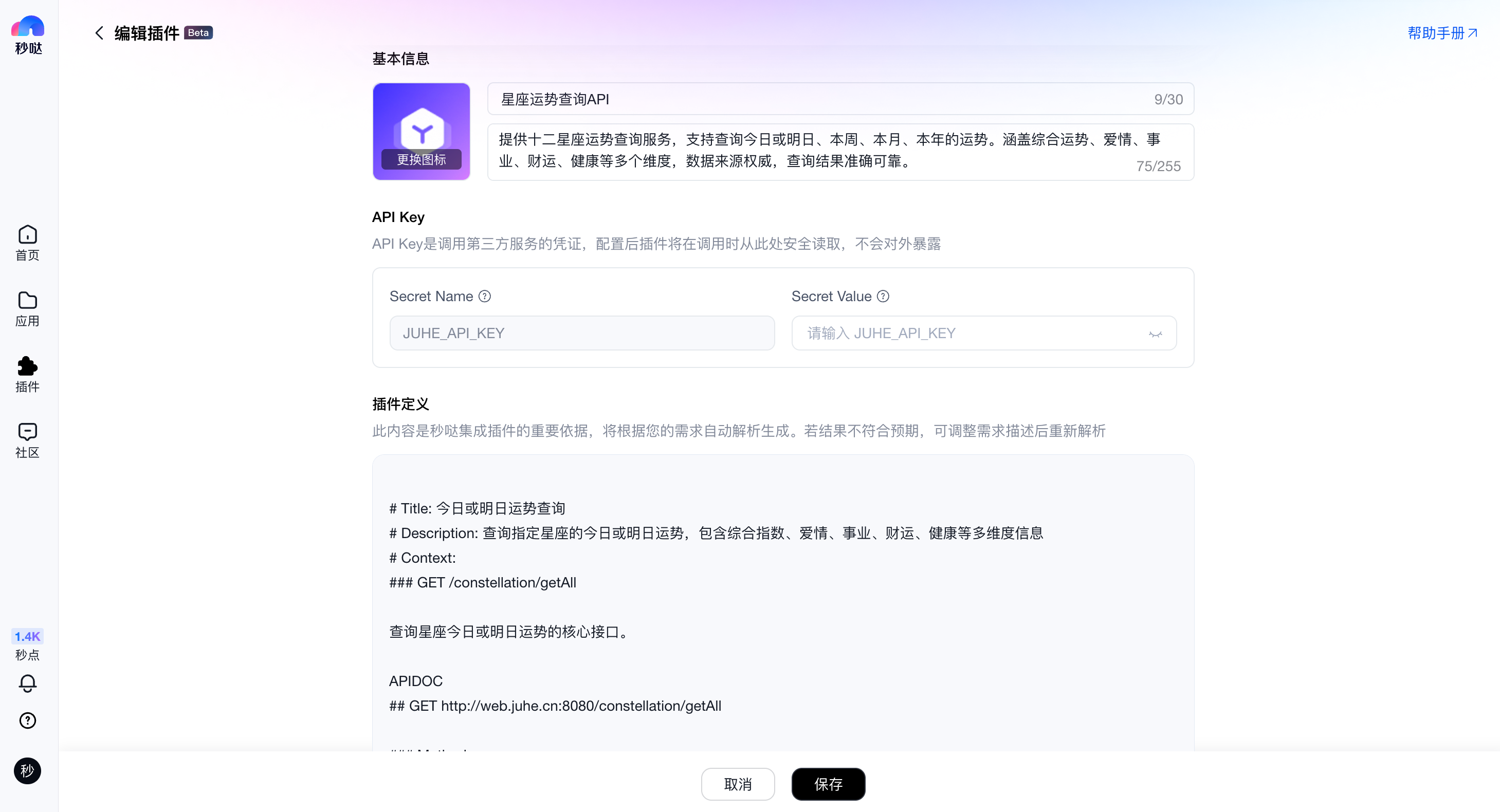 新增物理引擎、粒子特效、关卡设计和地图生成等核心能力,支持生成交互复杂度更高、动效与音效反馈更细腻、可玩性更高的创意互动小游戏,显著提升游戏表现力:用户可通过粘贴接口文档内容或URL生成秒哒插件,在生成过程直接使用。满足接入多样化业务API的需求,适用于接入企业自有API和非秒哒官方的外部服务,让应用功能灵活可扩展。