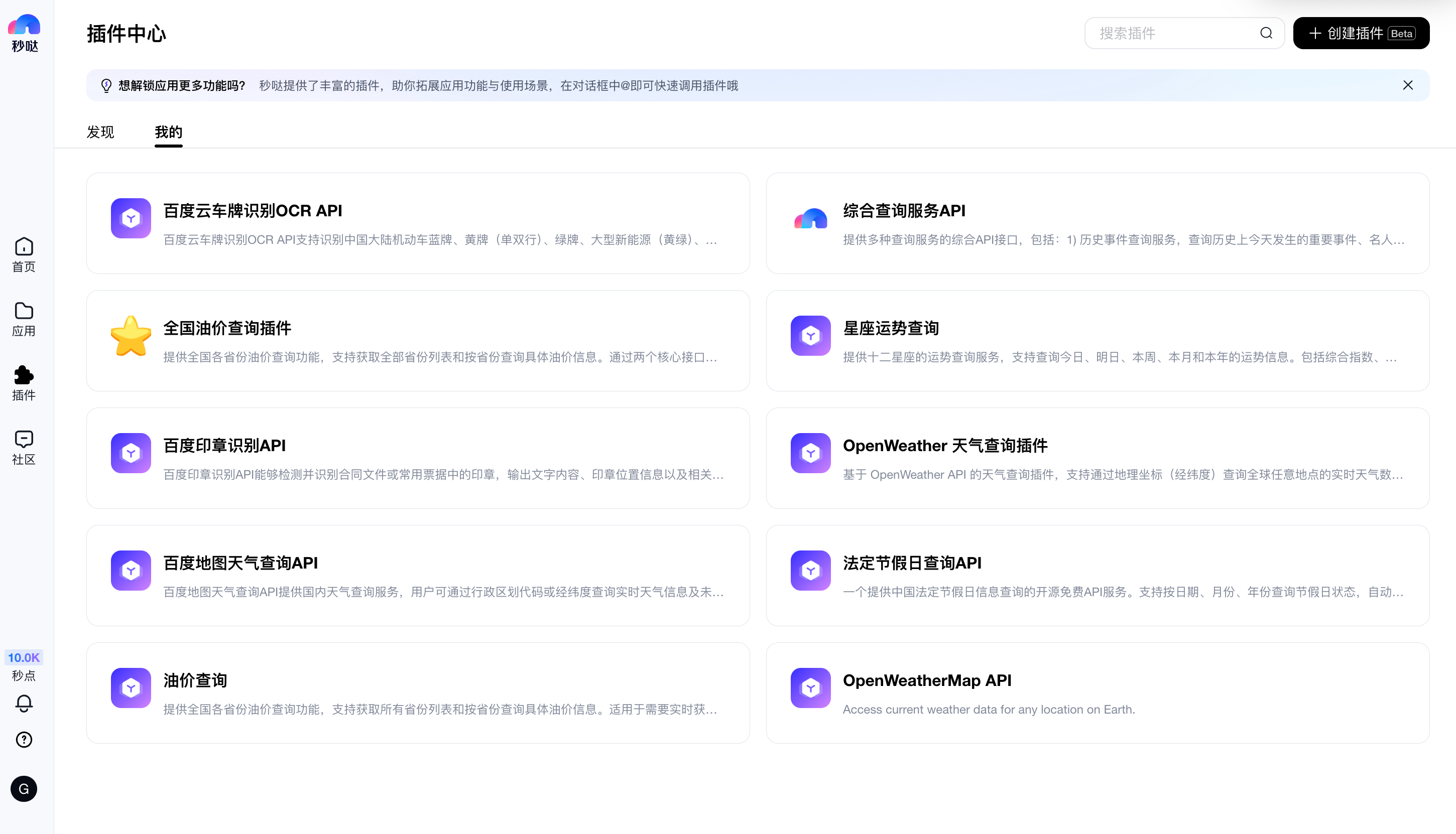 支持在插件广场查看所有官方插件,并在应用生成中@使用,帮助用户更高效便捷查看和配置已有插件能力,拓展应用功能与场景。
