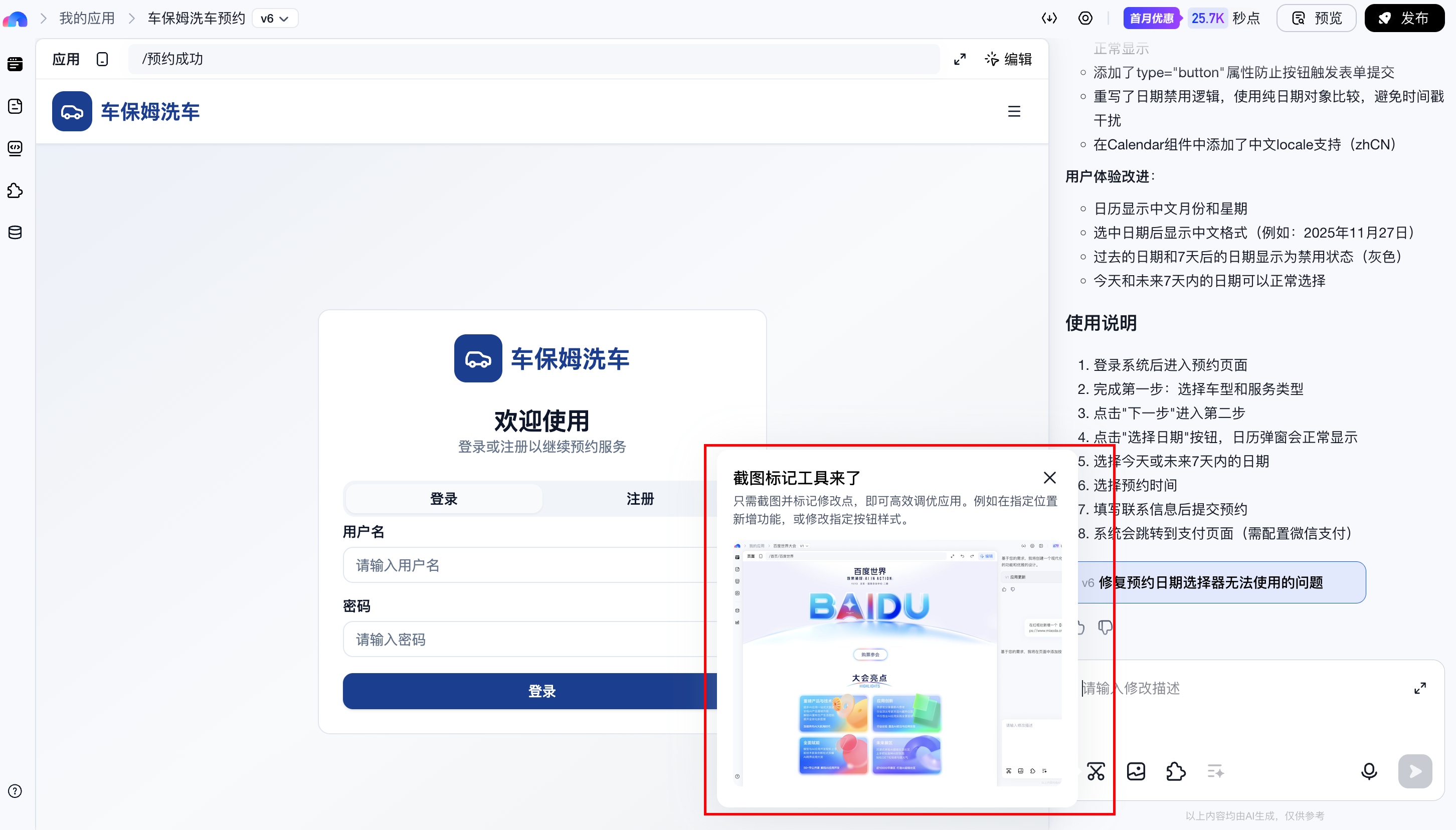 应用修改阶段新增截图工具,用户可截图标记修改点并加入对话,有效提升需求表达的清晰度与准确性,确保修改结果更精准可控。