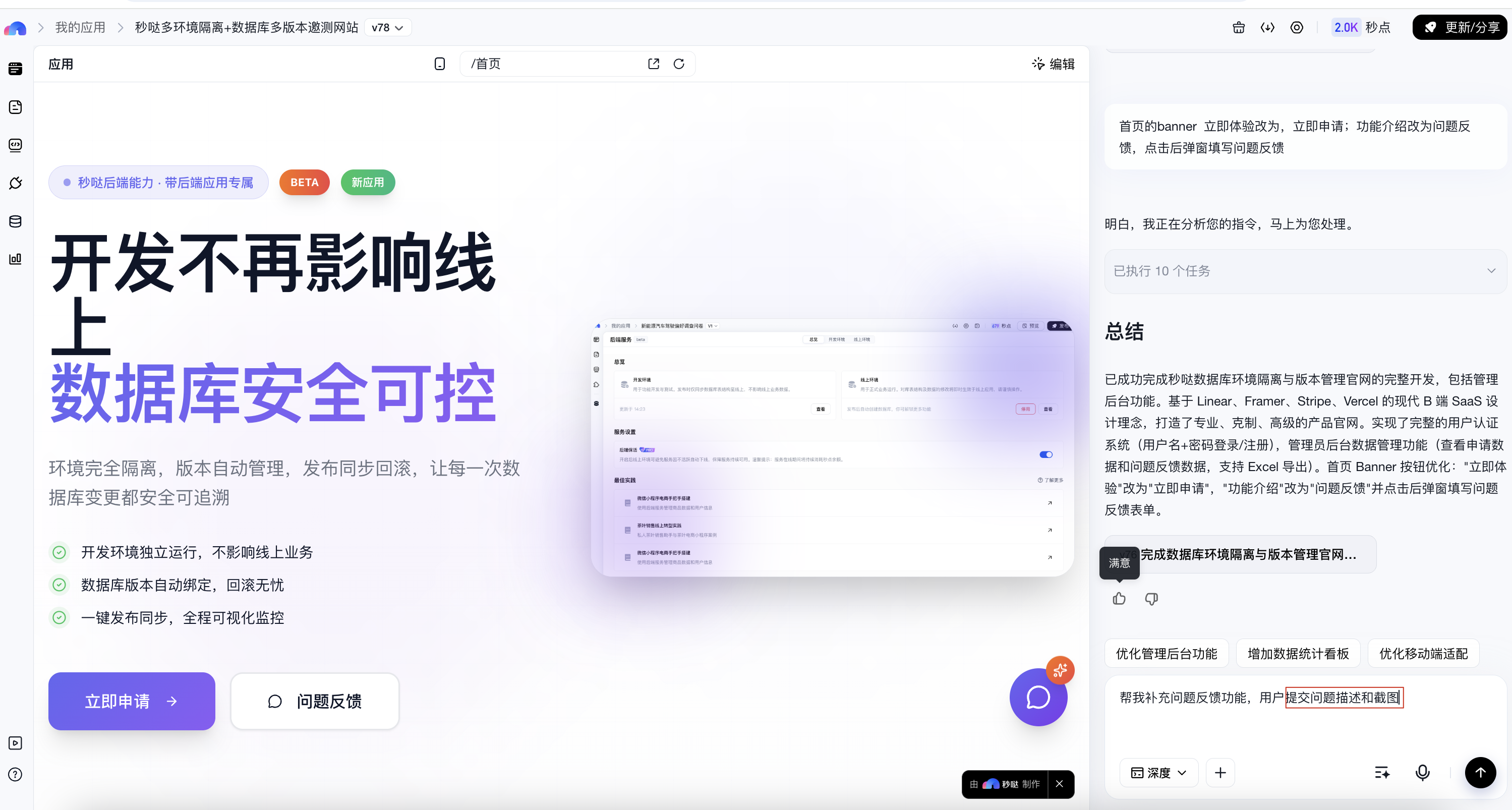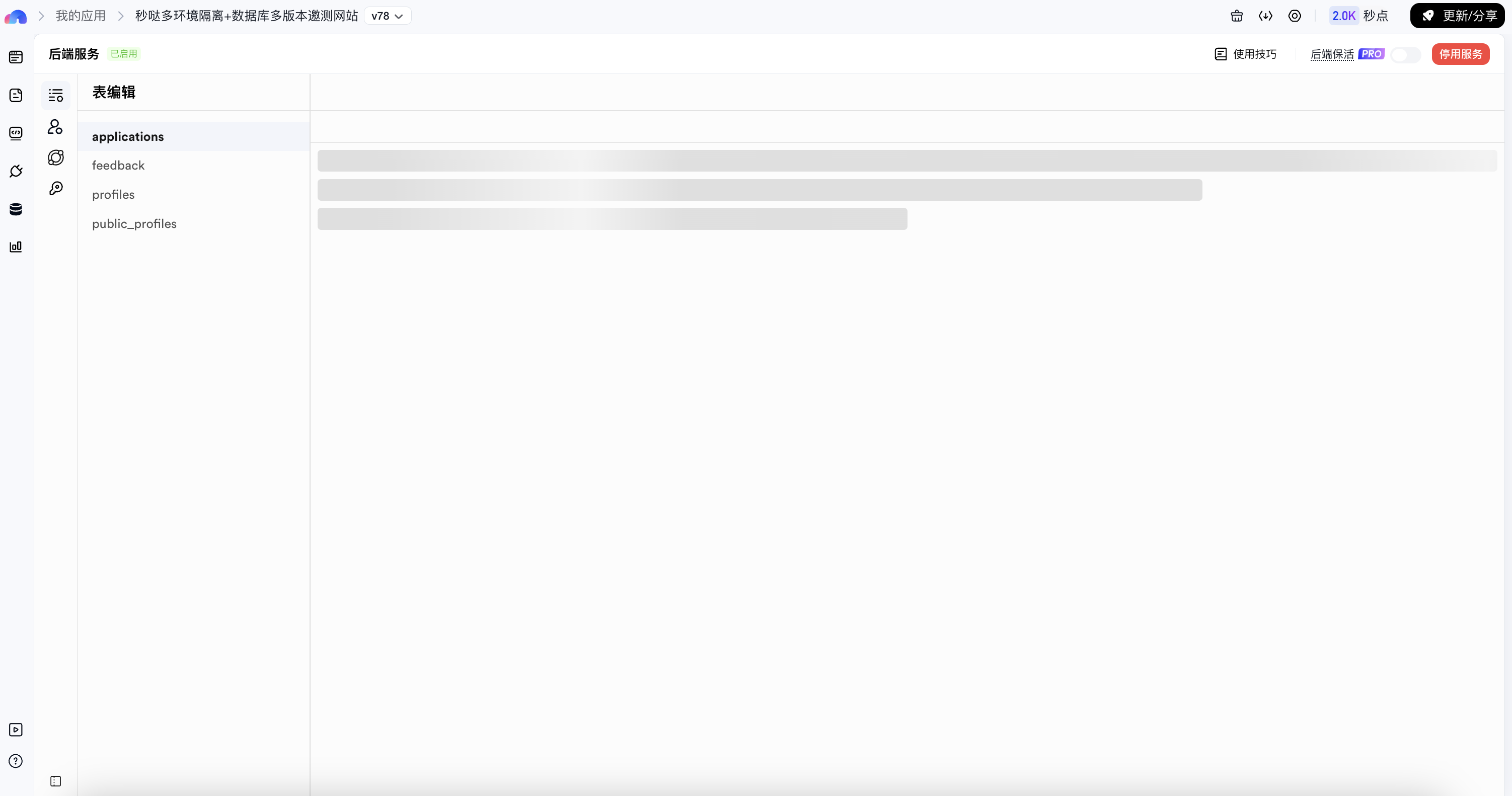 同时,秒哒提供数据库维护能力,支持开发者在后台直接查看与管理原始数据,用于数据核查与问题排查,如果当前应用不存在后端则不展示。