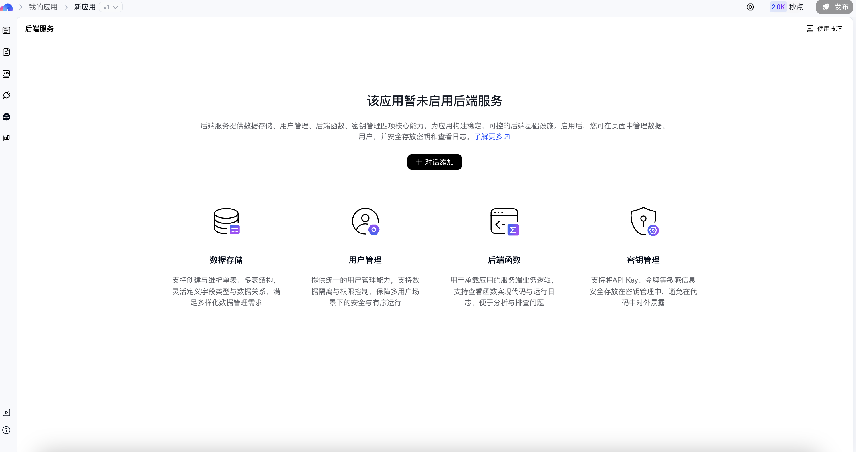 为帮助开发者更高效地使用秒哒后端存储能力,以下总结了一些在实际应用构建过程中的使用技巧与最佳实践,我们在首次生成、LUI修改阶段通过对话的方式增加后端服务。