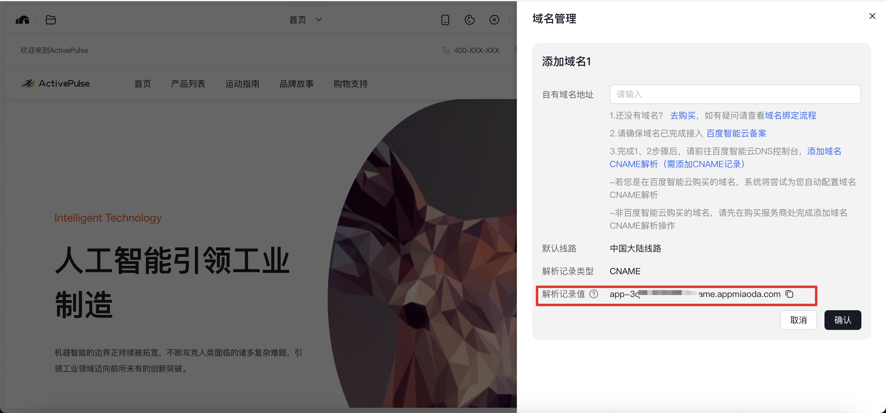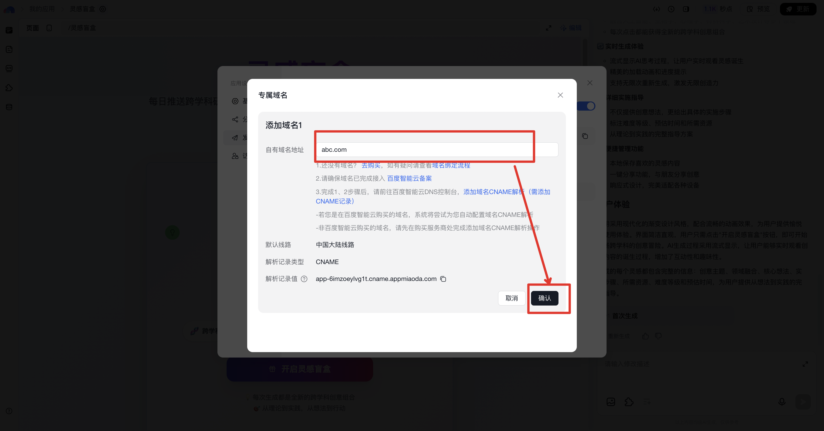 情况1: 若您是在百度智能云购买的自定义域名,秒哒会自动会您配置域名解析,您无需自行配置。只需在应用的域名管理中正确填写自定义域名,点击确认即可。