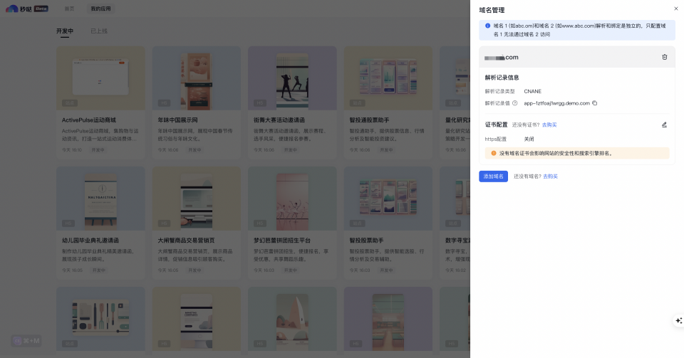 - 进入域名管理入口:在秒哒开发中的目标应用卡片上,找到域名管理入口。