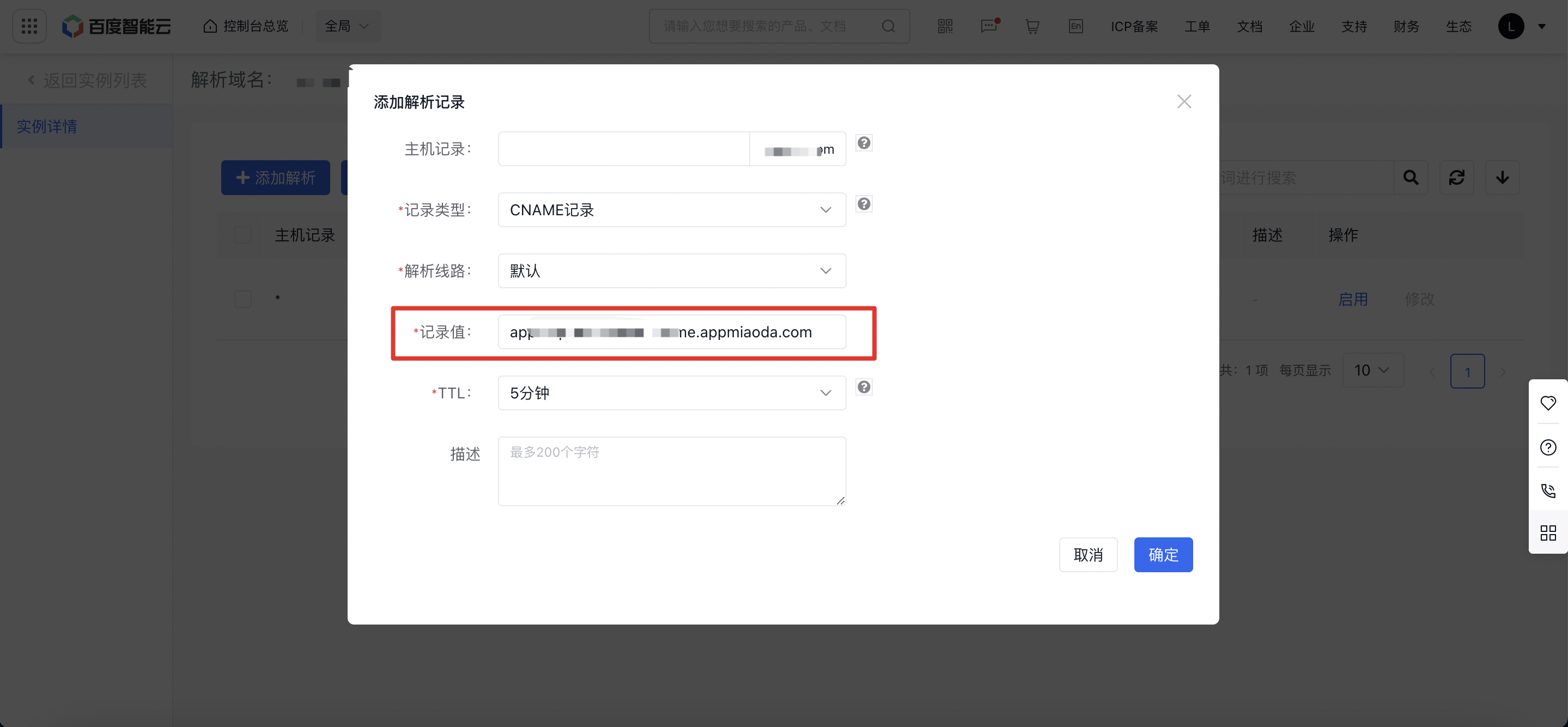 - 在域名购买对应的服务商平台上添加域名解析(示例为百度云路径,您需要找到第三方服务商的域名解析配置页面)。