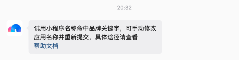 | 86011 | 试用小程序名称命中品牌关键字,可手动修改应用名称并重新提交,具体途径请查看 帮助文档 |