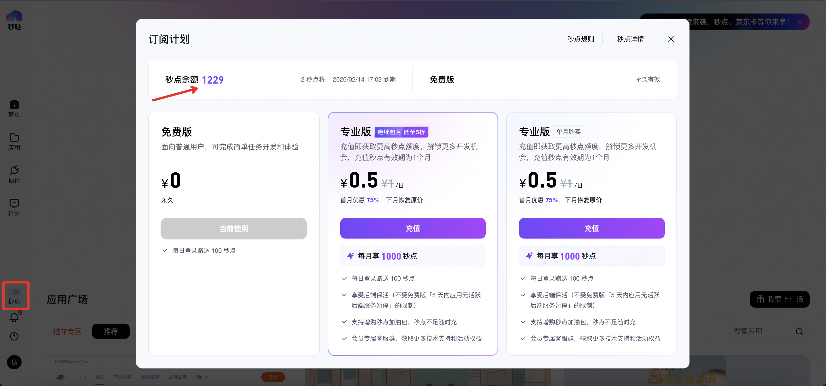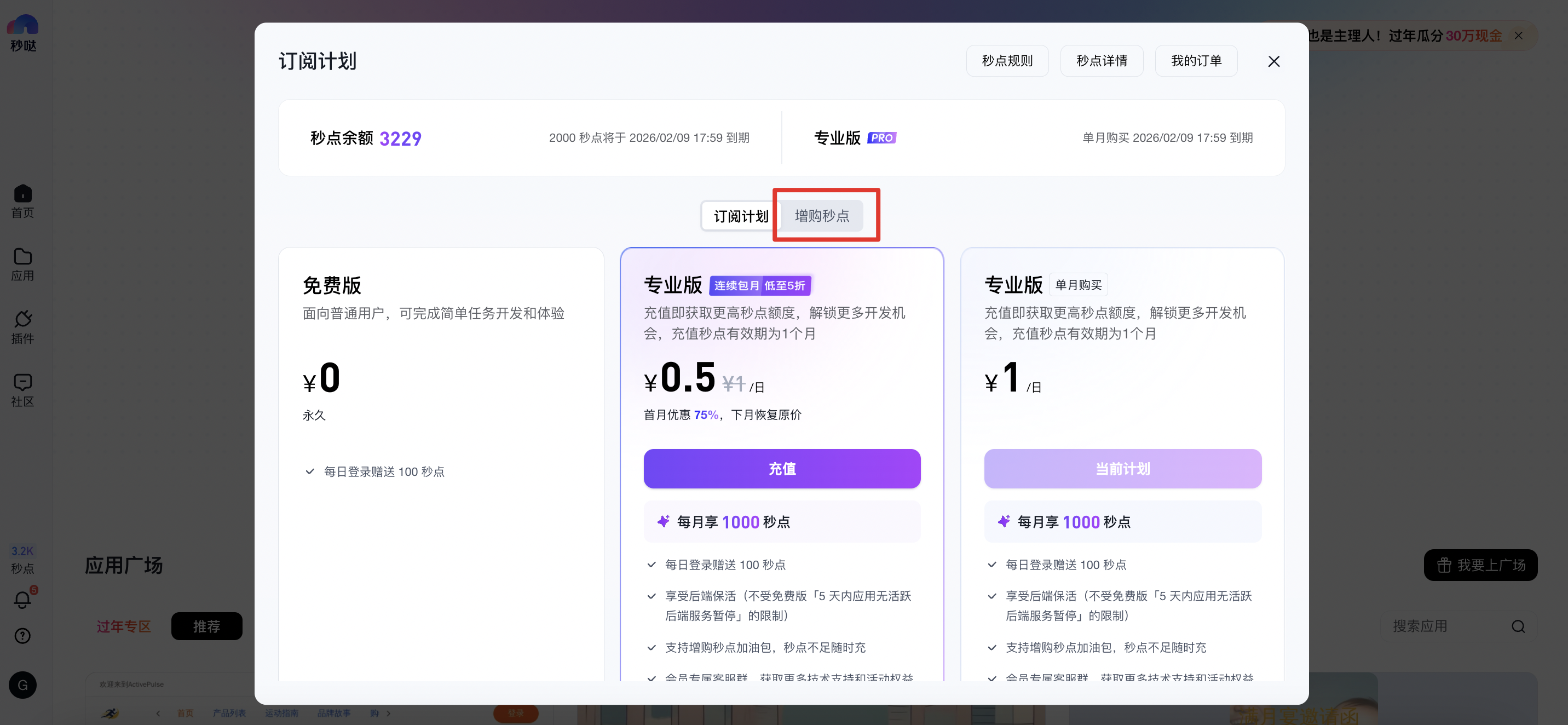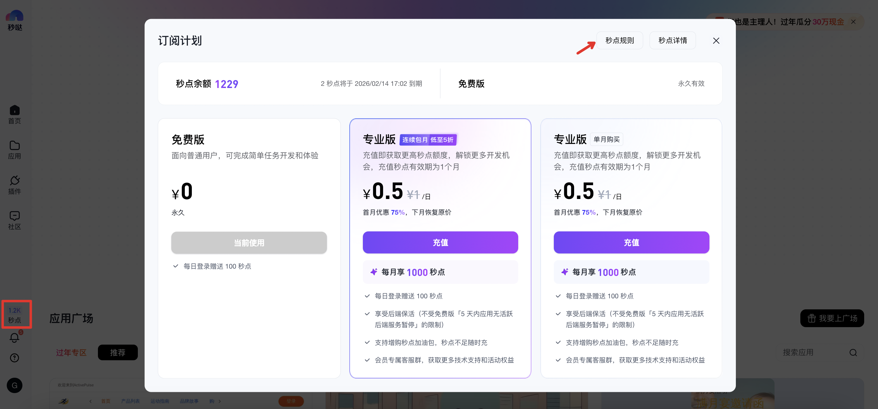 - 通过左侧导航秒点位置可进入订阅计划页面,可选择「专业版」订阅单月套餐或连续包月服务,月度套餐中默认含1000秒点,有效期1个月;