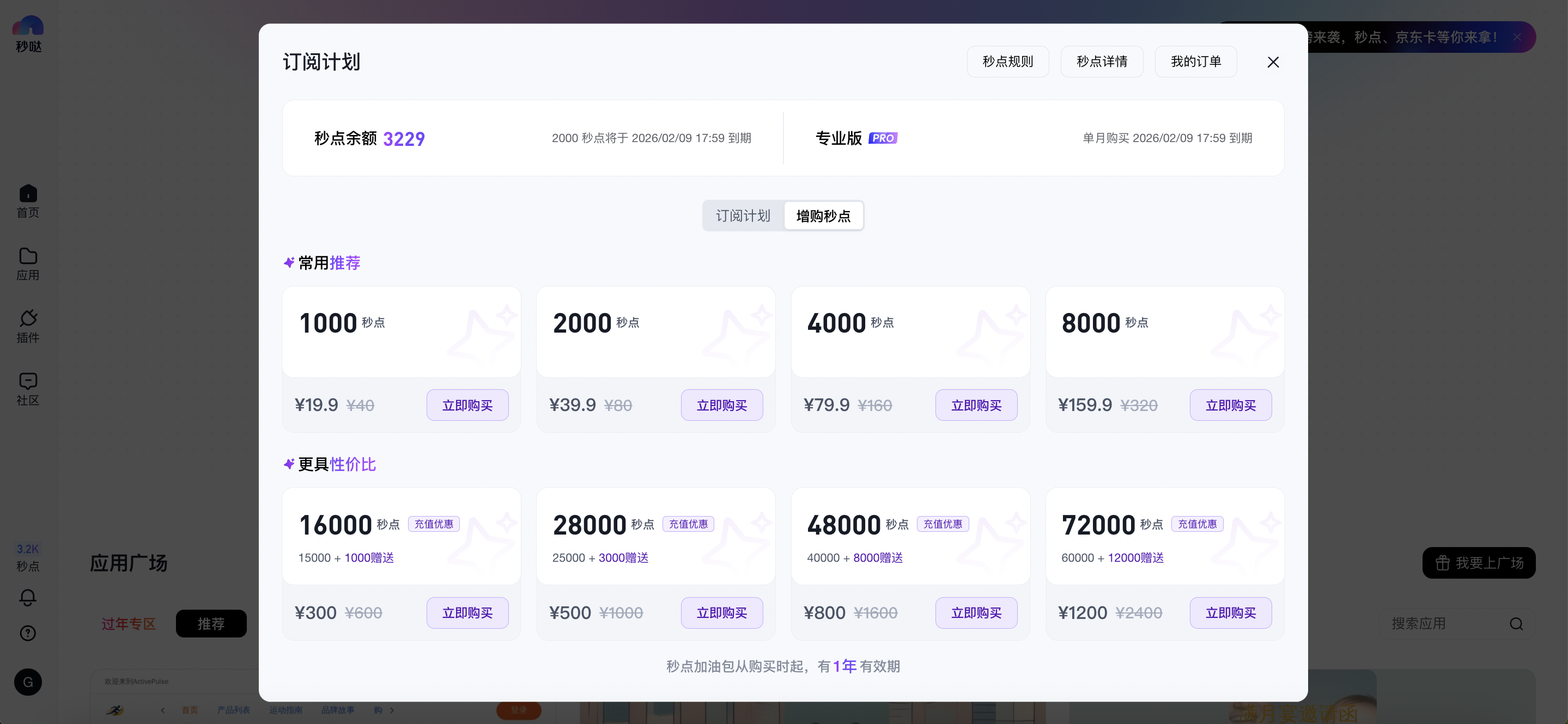 - 如订阅后秒点不够用,可单独增购秒点加油包,秒点加油包中的秒点有效期为1年,更不容易逾期失效;