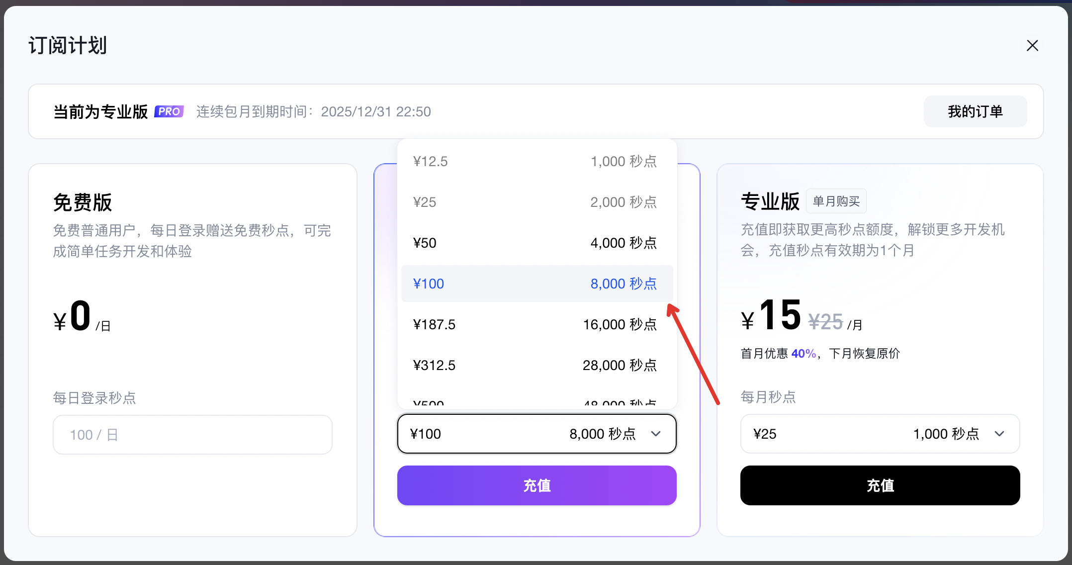 - 在「专业版」中选择需要充值的秒点,可以通过下拉选择要充值的档位;