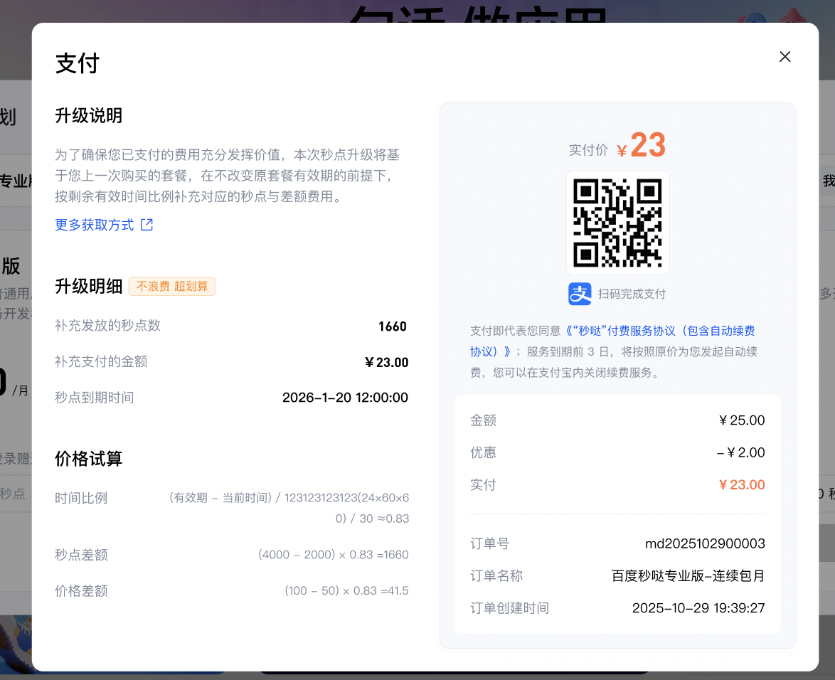 - 点击「充值」进入付款步骤,通过支付宝扫码完成付款,付款前请先查看《秒哒付款协议》。充值完成后即时为您发放秒点,可以通过秒点余额或「我的订单」查看秒点发放情况。秒点有效期为从“订单创建时间”起,1个月有效期。在秒点余额处可随时查看订阅秒点的到期时间,到期后如未继续充值,订阅秒点将被重置为0。