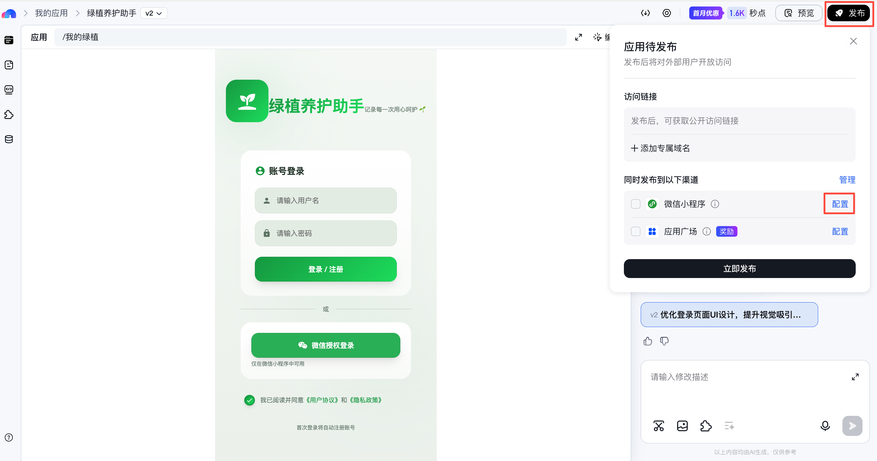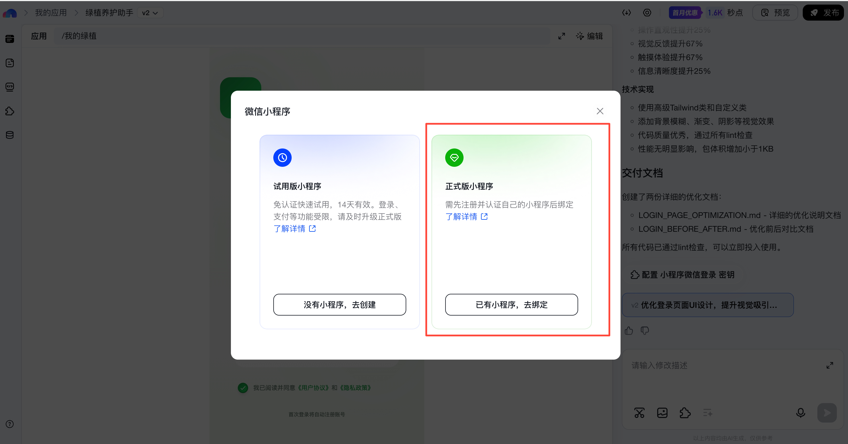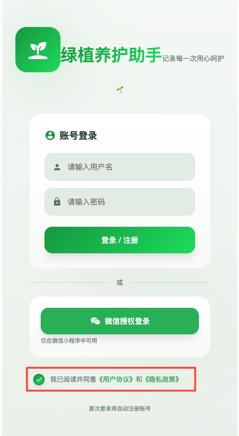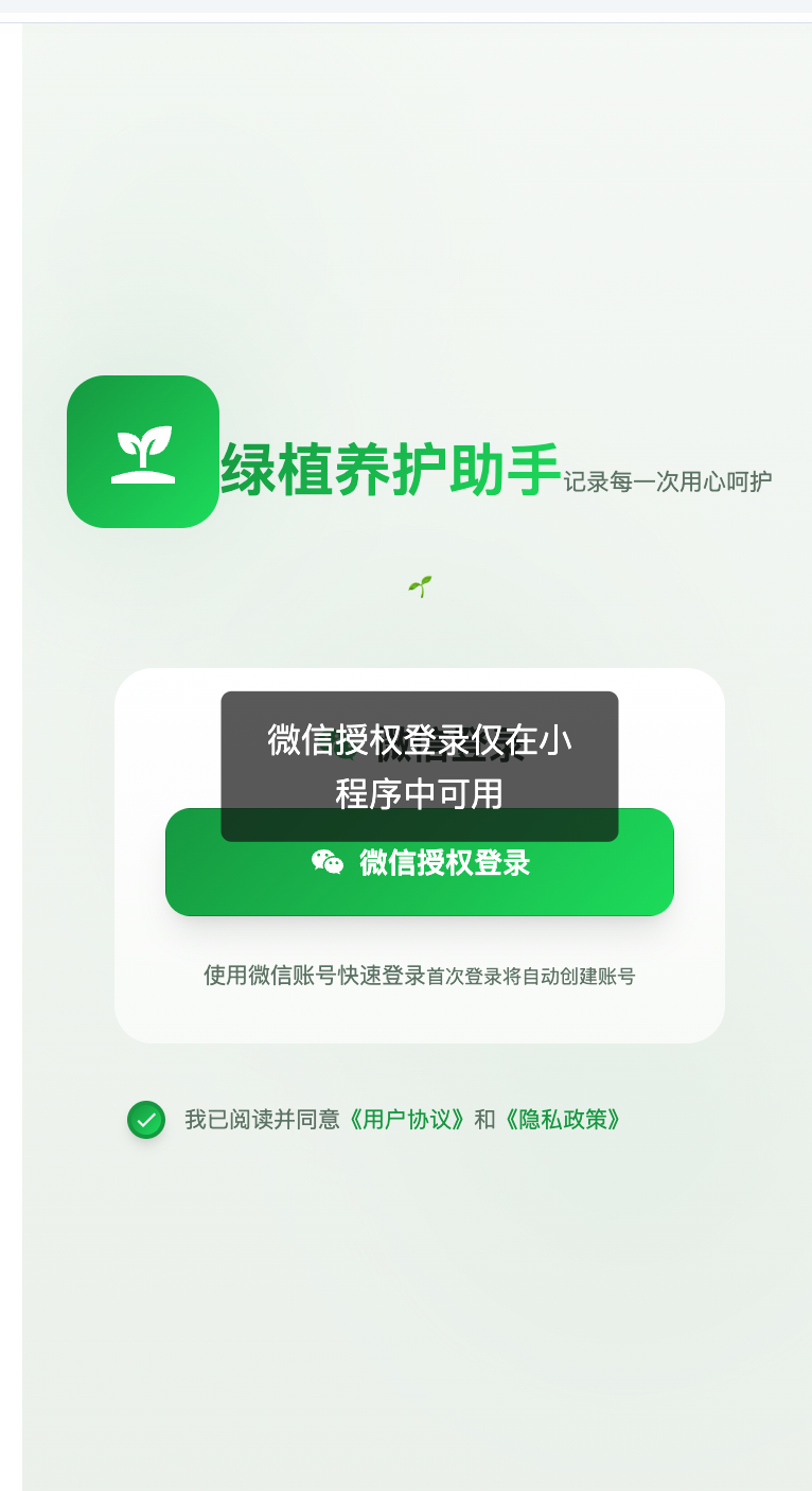 | 微信登录 | 帮我生成一个绿植养护记录微信小程序,需要支持微信登录,登录后查看自己的绿植养护记录,支持新增绿植养护记录。开发一款行程管理微信小程序,需要支持微信授权登录,登录后可查看过往行程记录,也能新增行程安排。 |