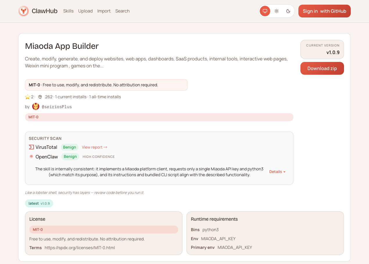 可以点击链接:https://clawhub.ai/seiriosPlus/miaoda-app-builder,或者直接在clawhub上搜索Miaoda。