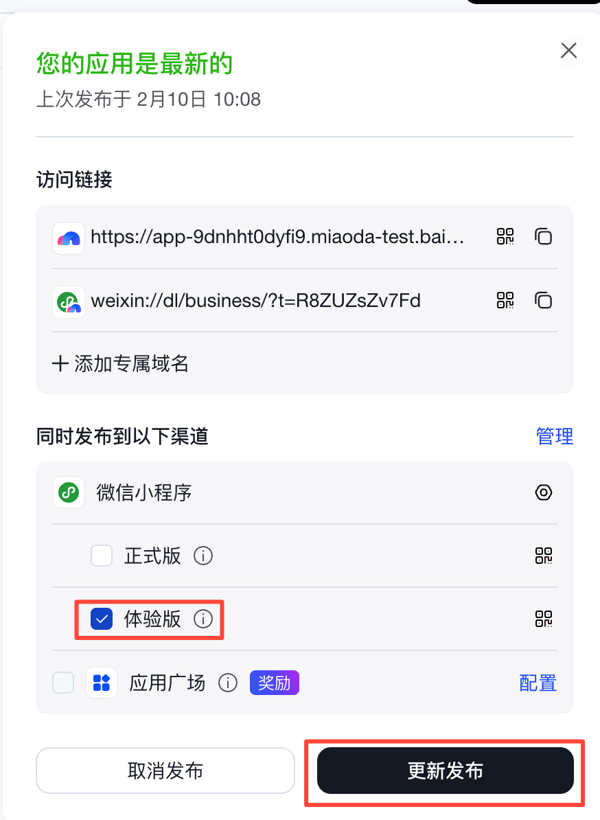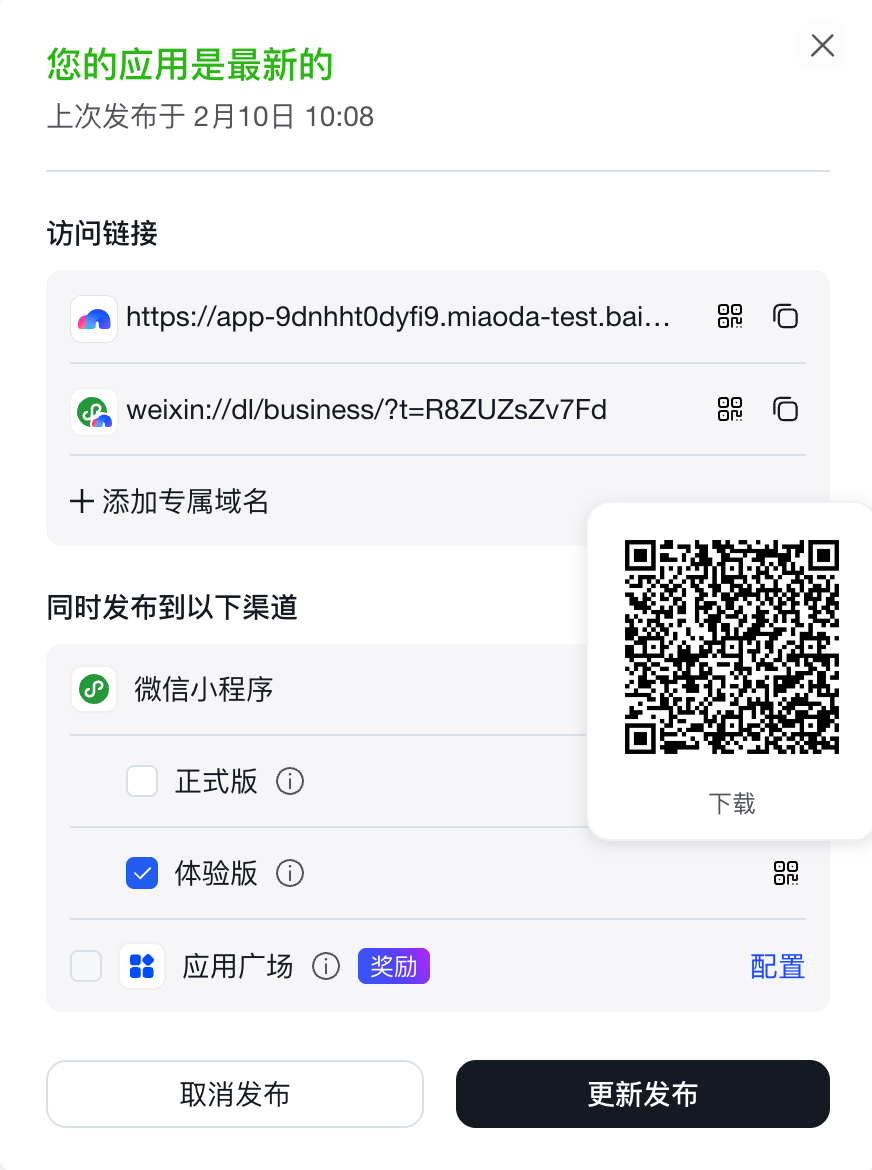 试用小程序创建成功后即进入14天有效期计时,发布后可通过二维码访问。创建成功后勾选该渠道并发布应用,即可通过扫描二维码访问您的试用小程序。