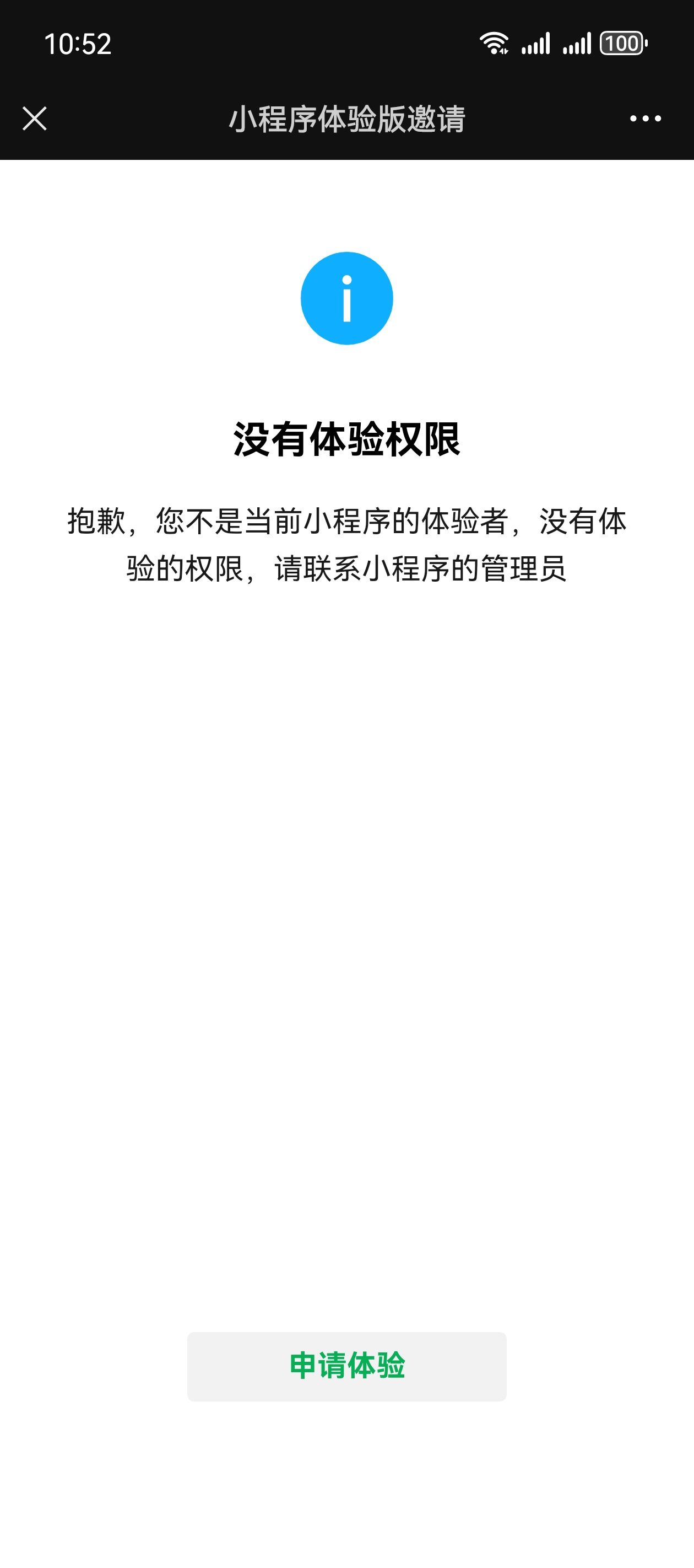首次访问体验版时,若没有体验权限,需向小程序的管理员发起申请,对应开发者的微信会收到申请通知,通过后,申请者可以访问体验小程序。