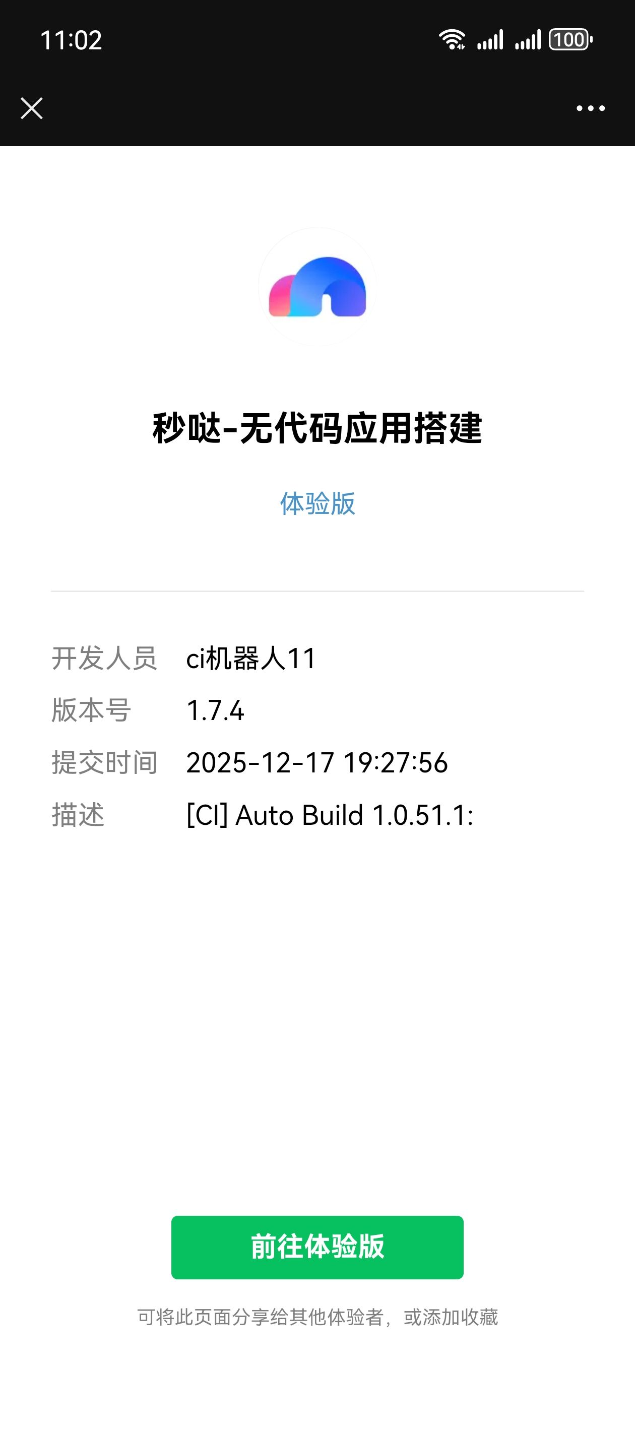 完成授权后,点击「更新发布」,秒哒为您向微信自动提交代码,可以通过小程序码或者链接访问该小程序。