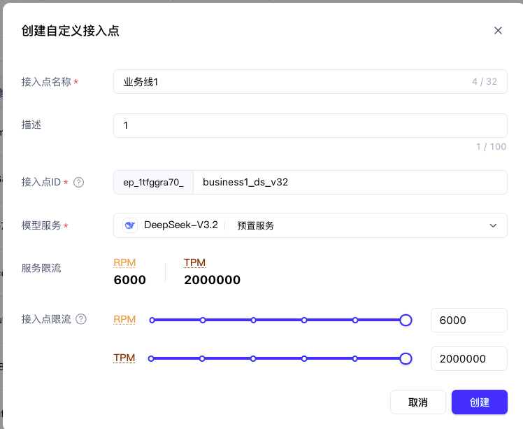 - 点击 创建接入点,按需填写接入点名称和ID(建议包含业务线或场景标识,如