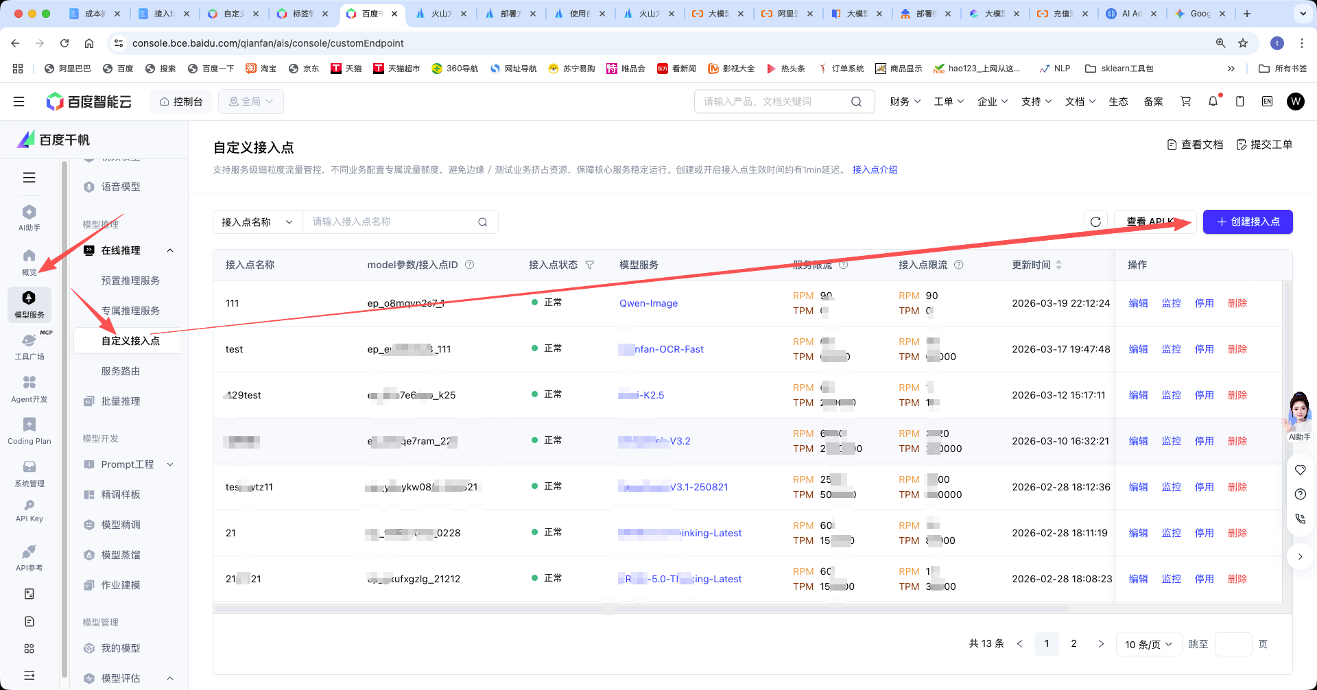 - 在左侧导航栏中,选择 模型服务 > 自定义接入点。