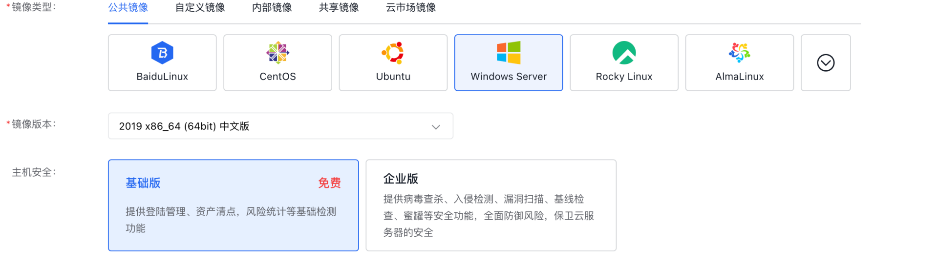 2.镜像选择 Windows 公共镜像,支持Windows Server 2019及以上版本。