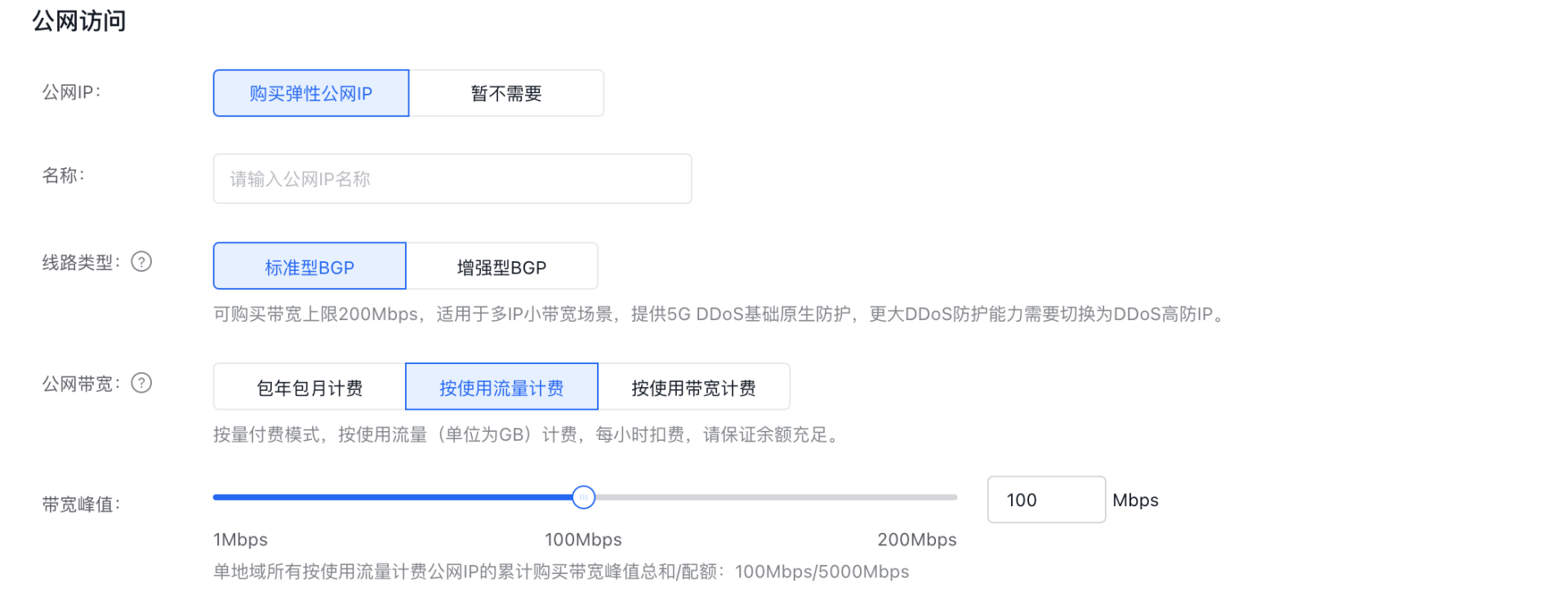 3.在购买页面同时选择“购买弹性公网IP”,并根据您的需要选择适合的计费方式和带宽峰值。