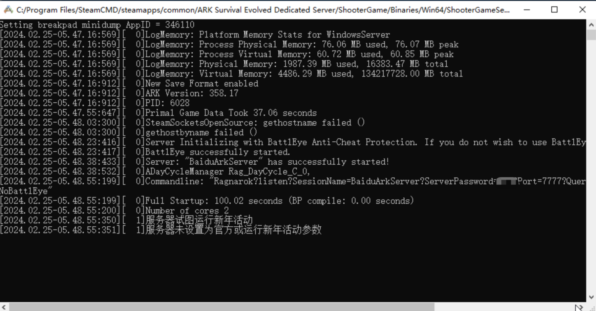 Enter the password: 输入需要设置的方舟服务器密码 ,用于玩家游戏连接服务器鉴权。