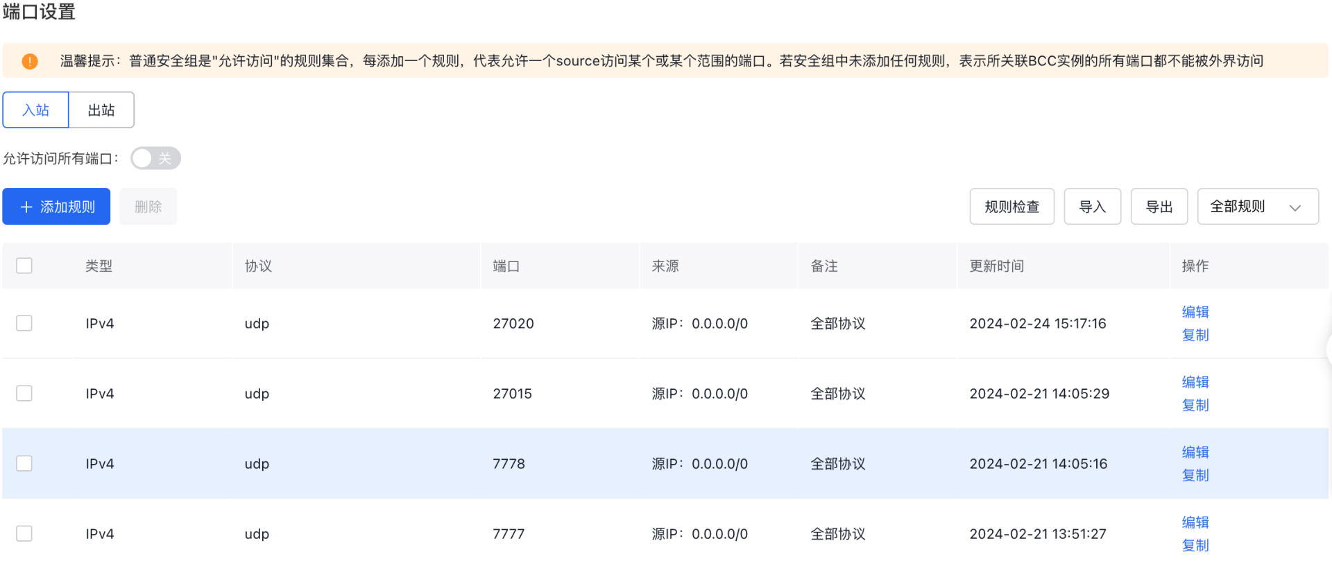 如您安全组中使用了自定义的规则,请务必操作安全组入向规则放行TCP、UDP端口7777、7778、27015、27020端口。