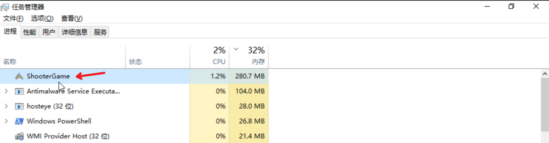 打开 任务管理器,找到 ShootGame 游戏进程,右键结束服务。