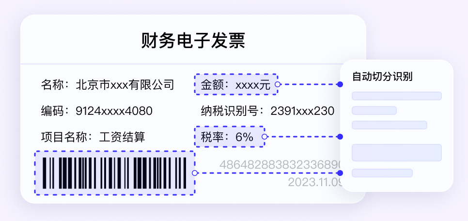 对10余种常见税务发票、差旅票据自动分类、识别、录入,可快速对接国税平台进行增值税发票验真,适用于企业税务核算及内部报销场景,释放企业人力,简化业务流程