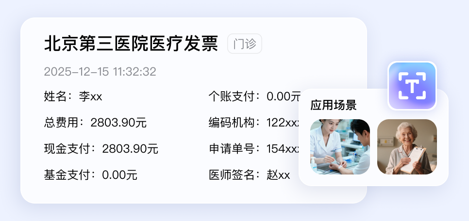 识别患者身份信息/各类医疗票据/医疗仪器盘数据,提升信息录入效率,助力提高保险理赔整体时效,并辅助病患管理、健康监测、处方单电子化等